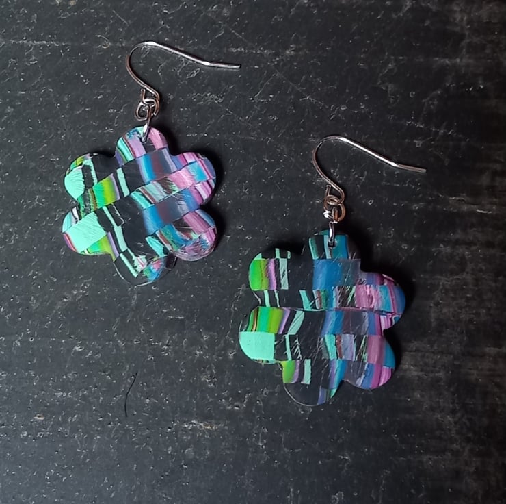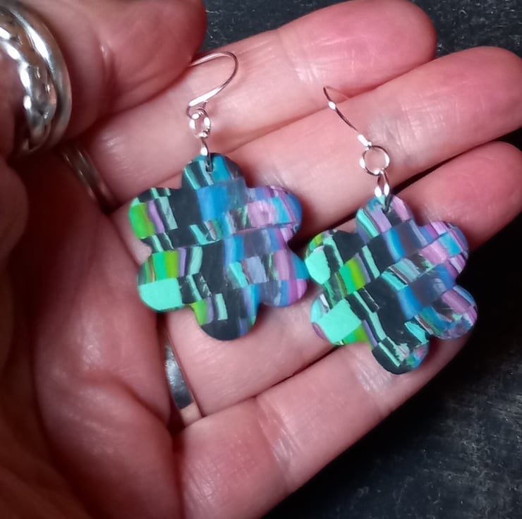Pretty pixel style earrings in various colours including purple, black and green. The polymer clay veneer came about when I was messing about with a striped cane, I just moved slices around until I got this great design.