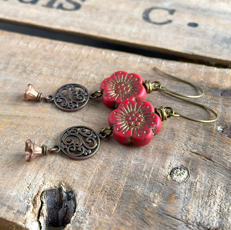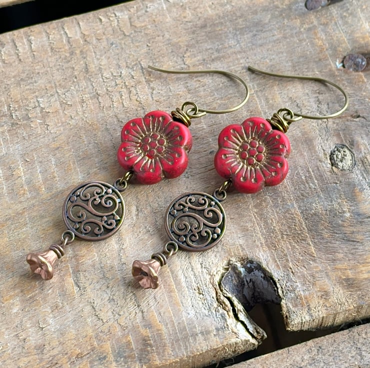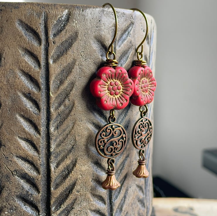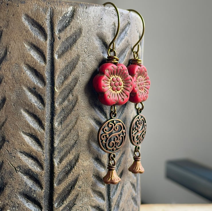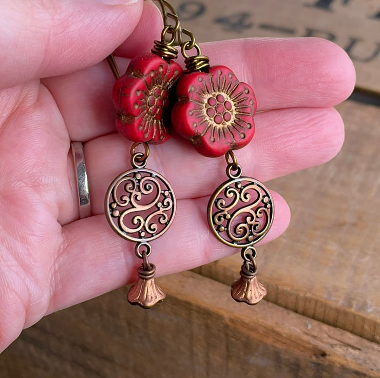 This colourful pair of earrings feature Czech glass Anemone blossom beads in a warm shade of red with a rustic golden wash highlighting the detail in their carved centre.