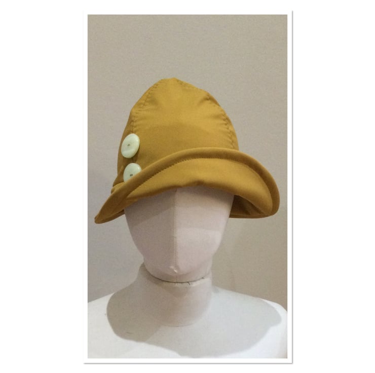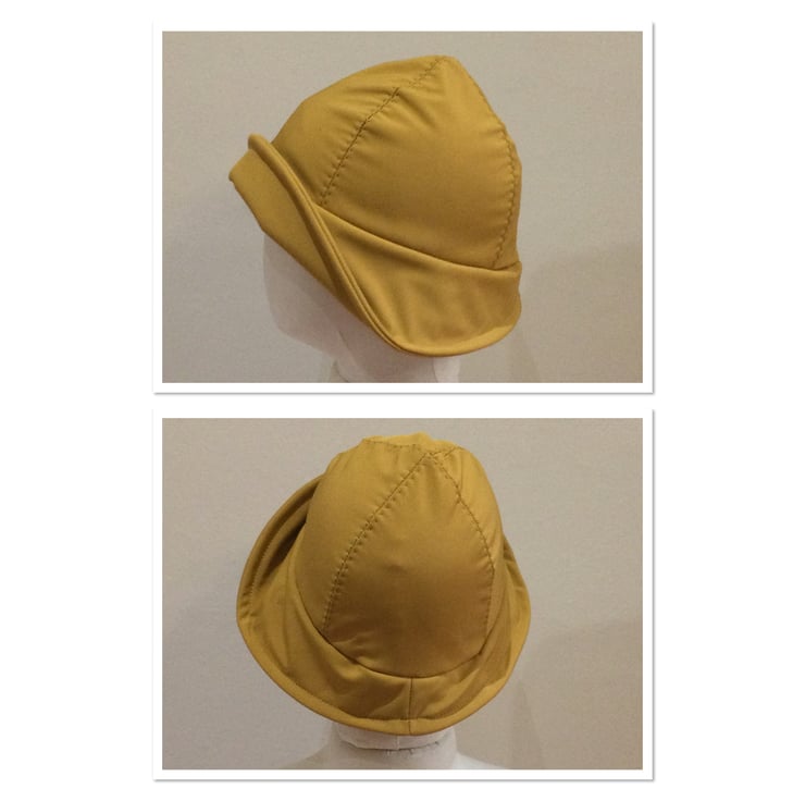 Asymetric cloche style rain hat can be worn with brim turned up or down . Made from soft shell fabric which is water repellent on the outside and cosy fleece lined on the inside. Made to fit an average head-size 22.5”