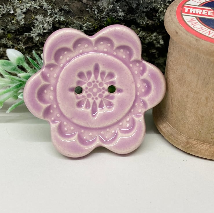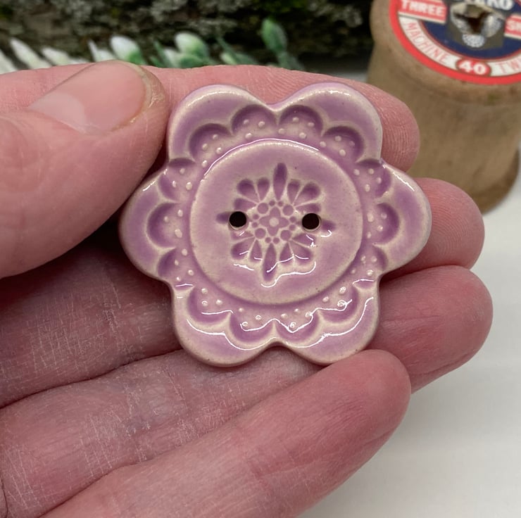 This large pottery button is made from white earthenware clay, embossed and glazed on the front. It is then fired to 1100 degrees, so nice and strong. Slightly concave. It measures 4cm x 3.5cm.They can be handwashed or machine washed on a low temperature. Perfect for all sorts of arts and craft projects.