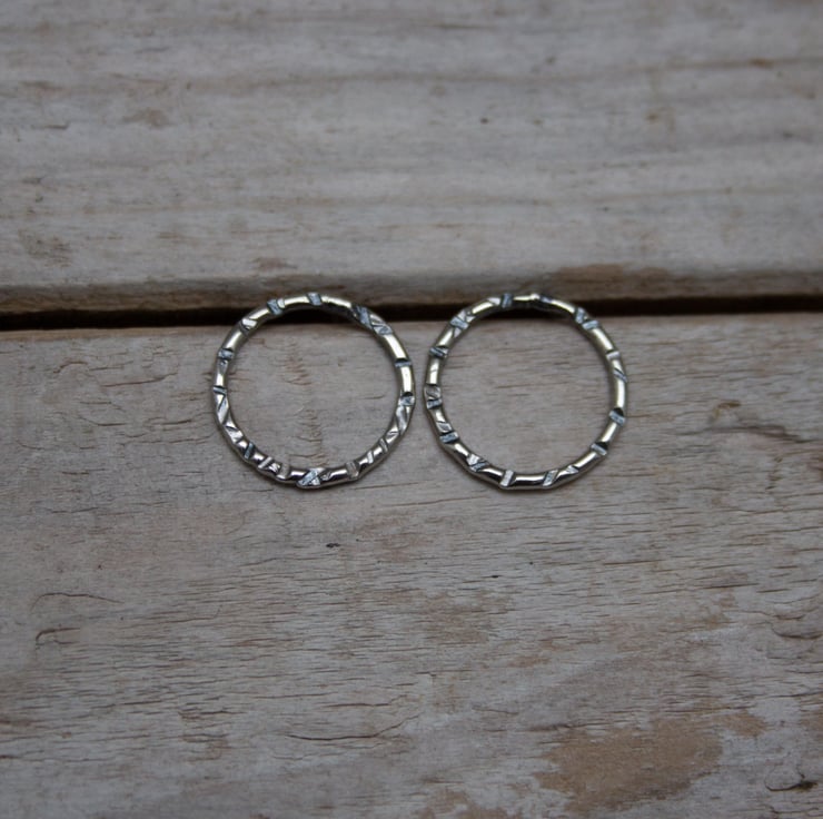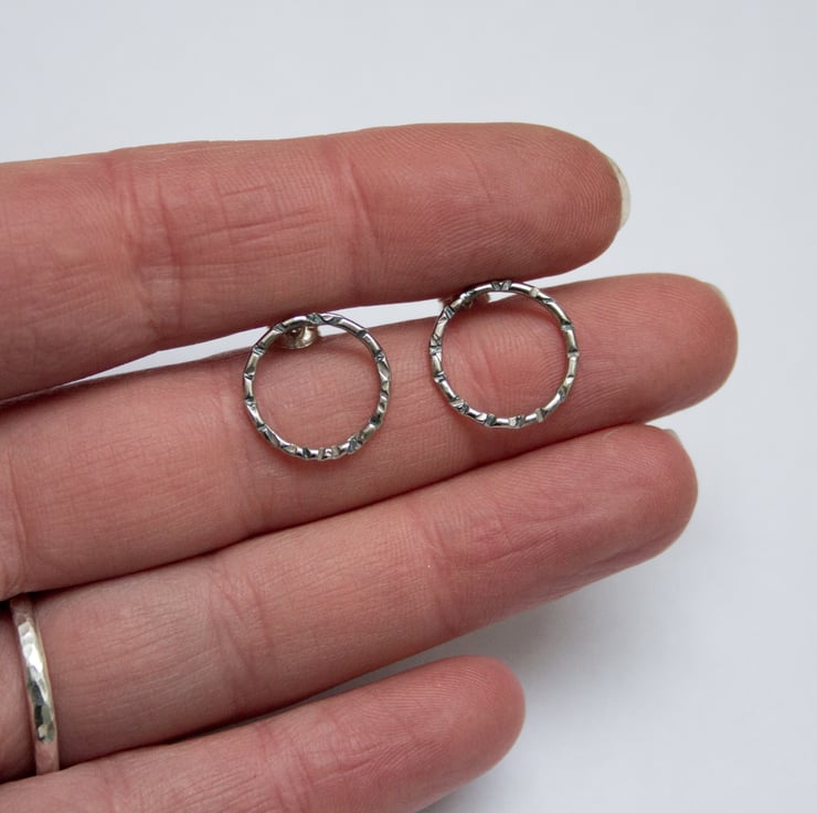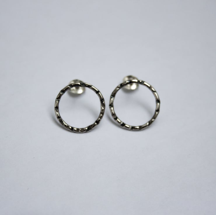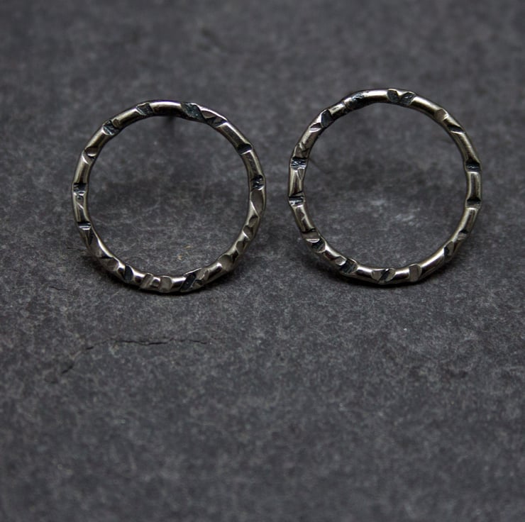 Recycled sterling silver circles with a hammered texture affixed to 0.8mm sterling silver ear posts. These studs have been oxidised and gently polished to emphasise the highlights and shadows of the textured surface.