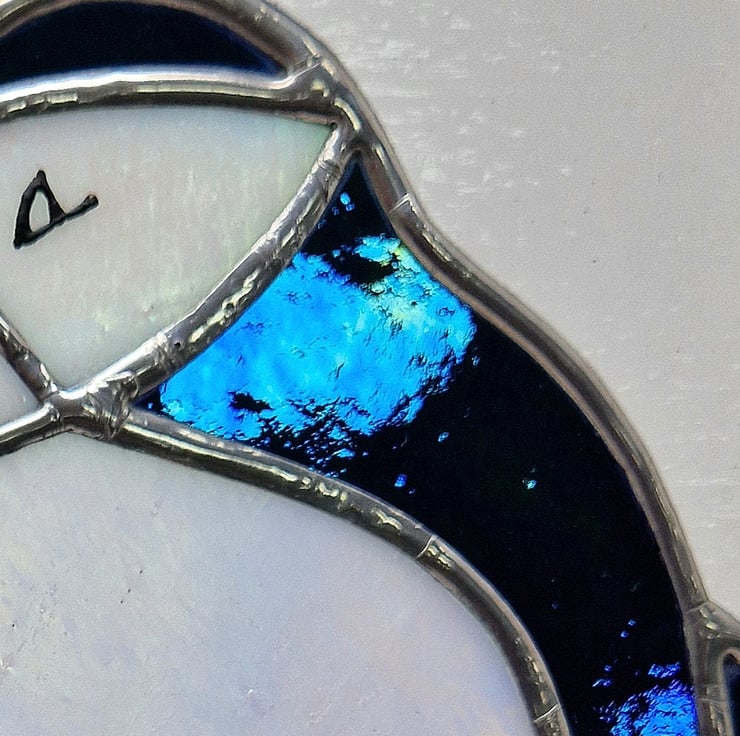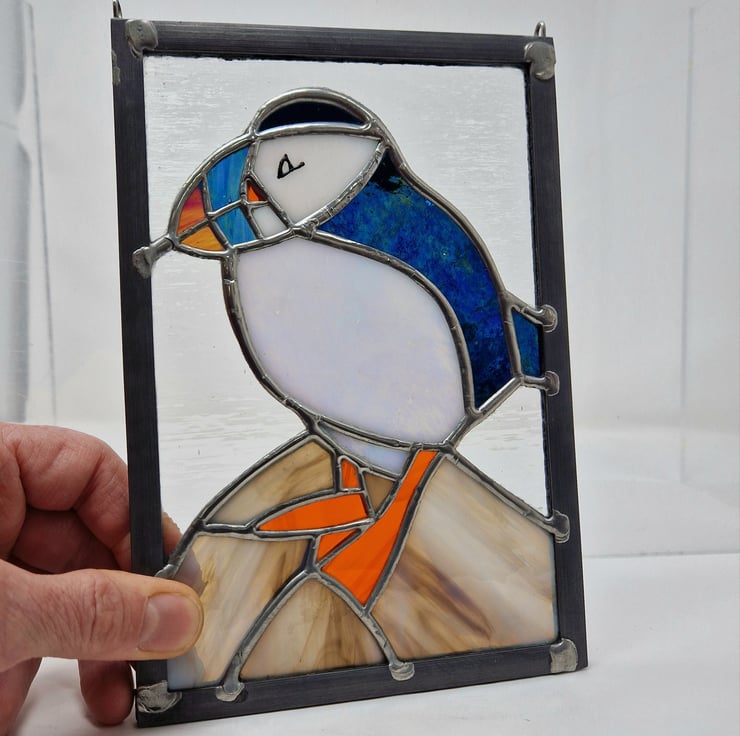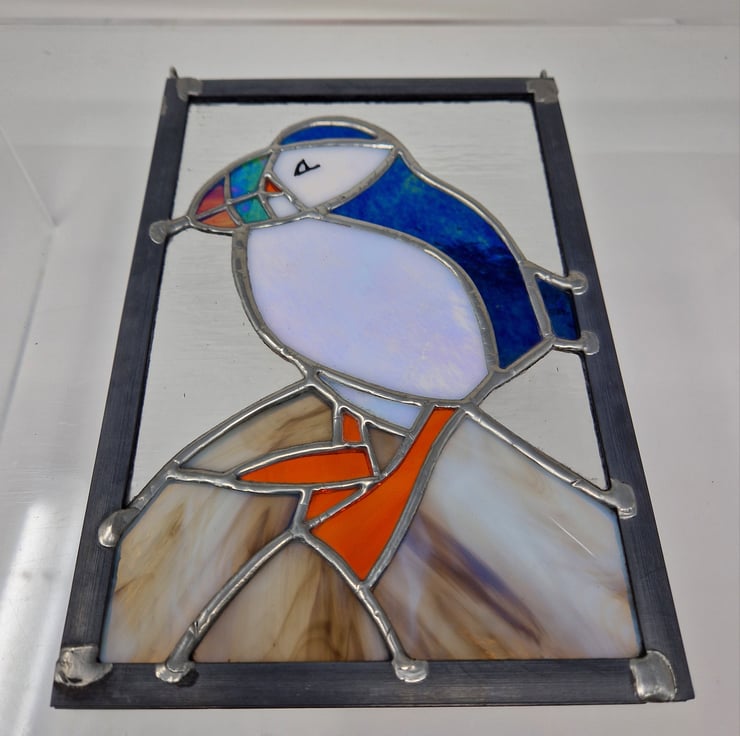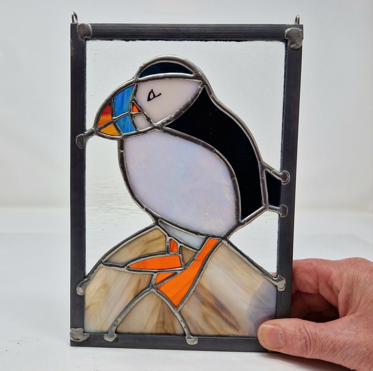 This puffin panel is made with cut glass, copperfoiled, soldered then given a lead edge to make it a substantial piece.