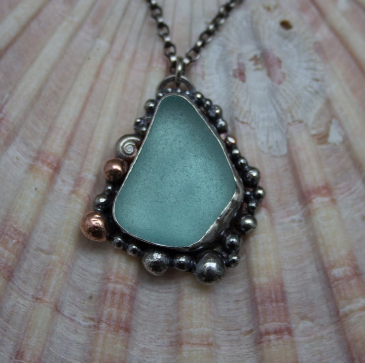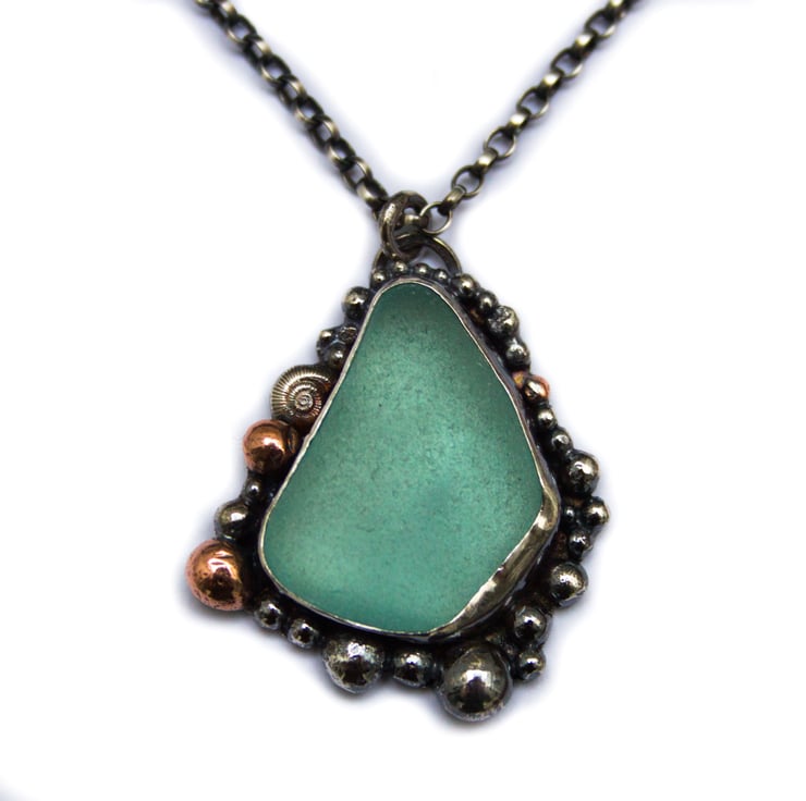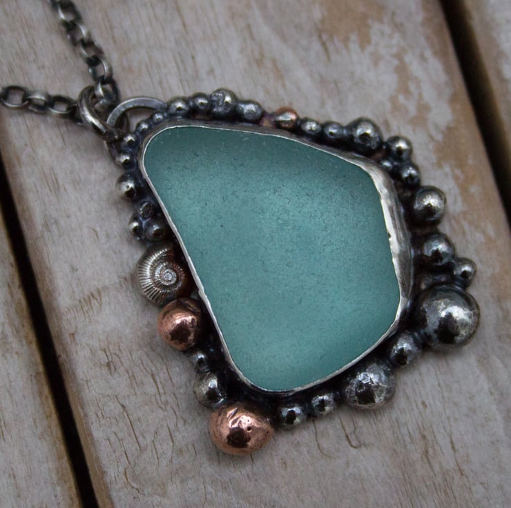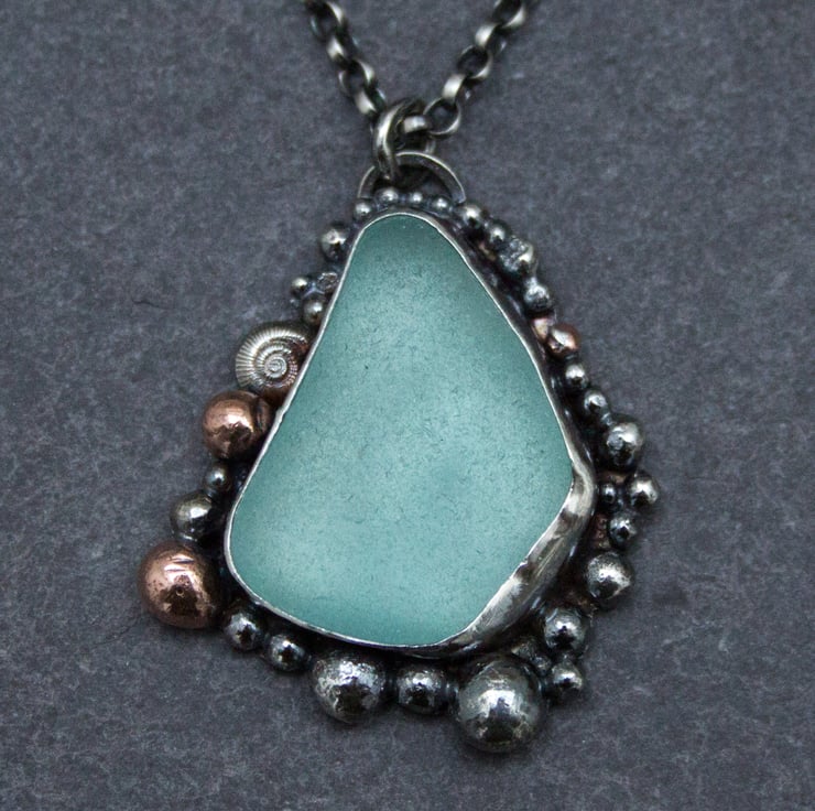 A gorgeous, deep aqua coloured piece of sea glass set in recycled fine and sterling silver and surrounded by silver and copper pebbles and even a little silver ammonite.