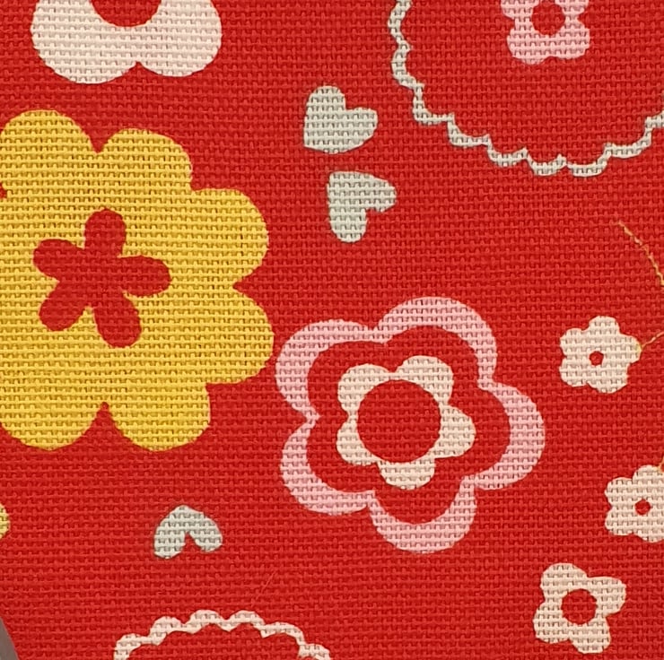 A bright and colourful retro look flower pattern with a light pink binding