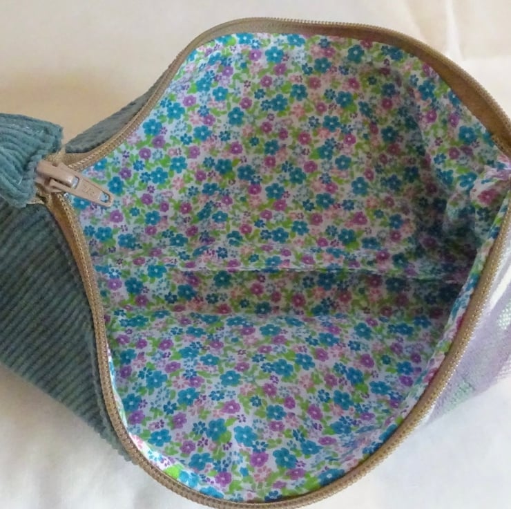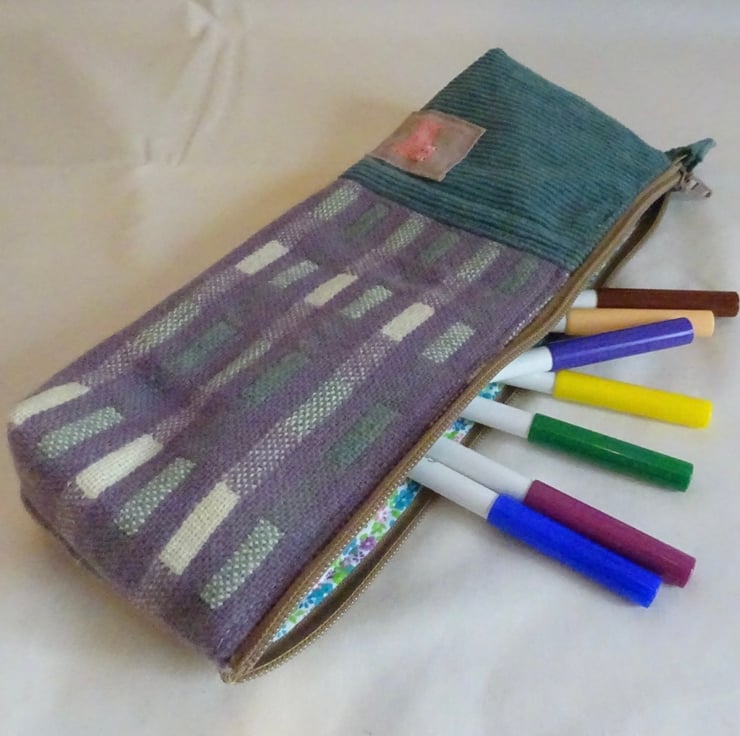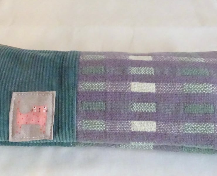 The bag is made from a piece of handwoven fabric and a piece of jumbo cord fabric. The handwoven section is lilac, duck egg blue and white. The jumbo cord is seagreen. It is lined with a delightful polycotton print and has a zip to keep the contents secure. The handwoven section was woven on my Louet floor loom and the bag was sewn by me. A cat motif has been sewn on the outside of the bag to define it as part of the Weaving Cats range.