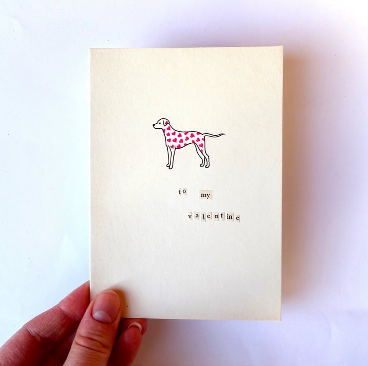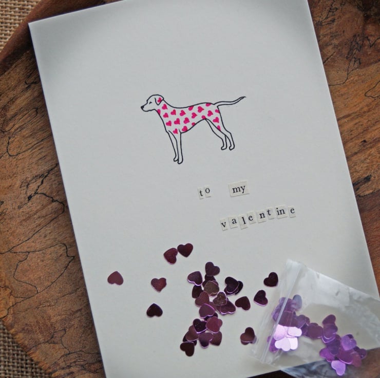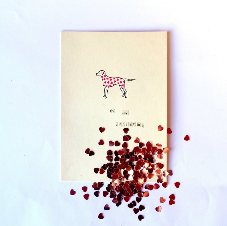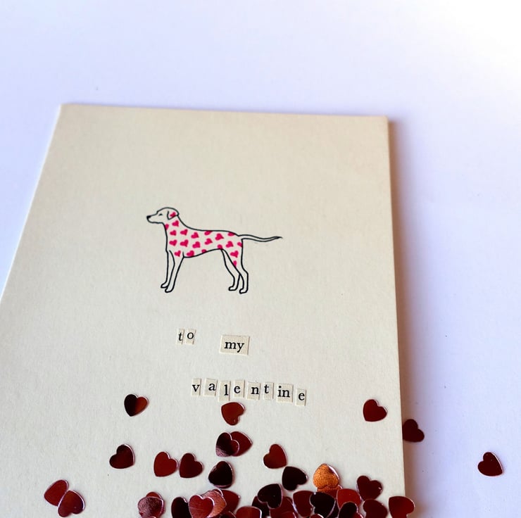 Cream coloured card with an individually hand drawn Dalmatian dog design depicting the playing card pattern of bright pink hearts in place of spots. The words to my valentine are written in lettering cut from a recycled book. Card comes with a sachet of pink heart sequin confetti to sprinkle inside the card before it goes in the envelope. This card is also available in red.