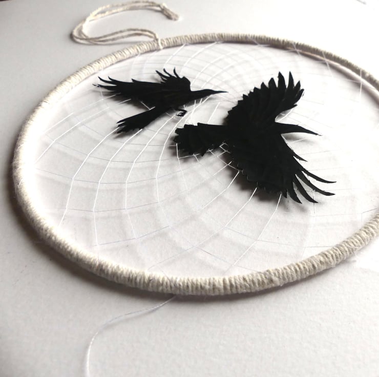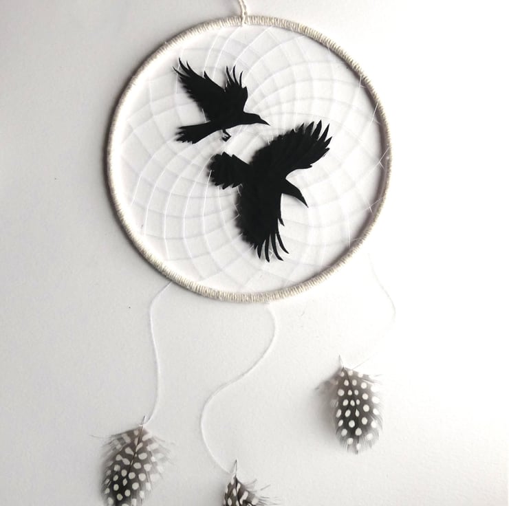 Unique handmade raven spirit dreamcatcher with two flying ravens