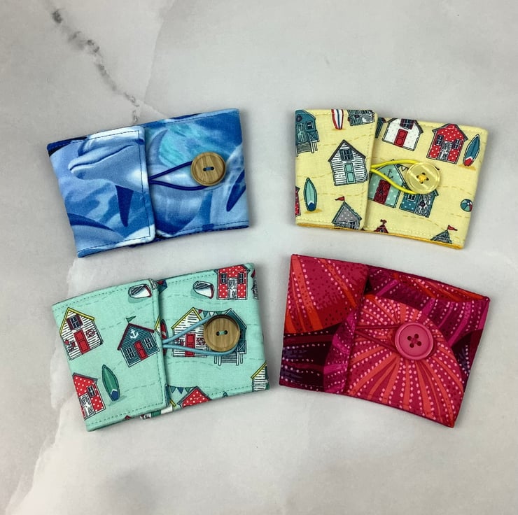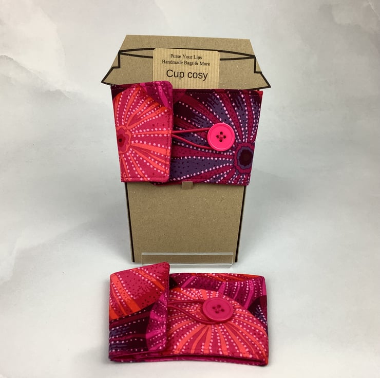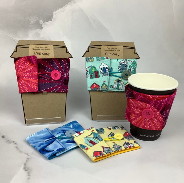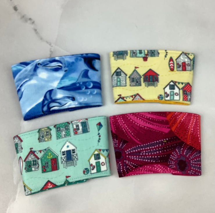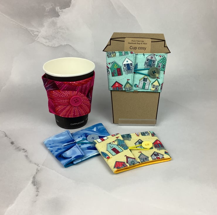 Each of my unique cup holders is individually made by me in my relaxing and tranquil little West Sussex garden studio so the pattern placement and button may vary.