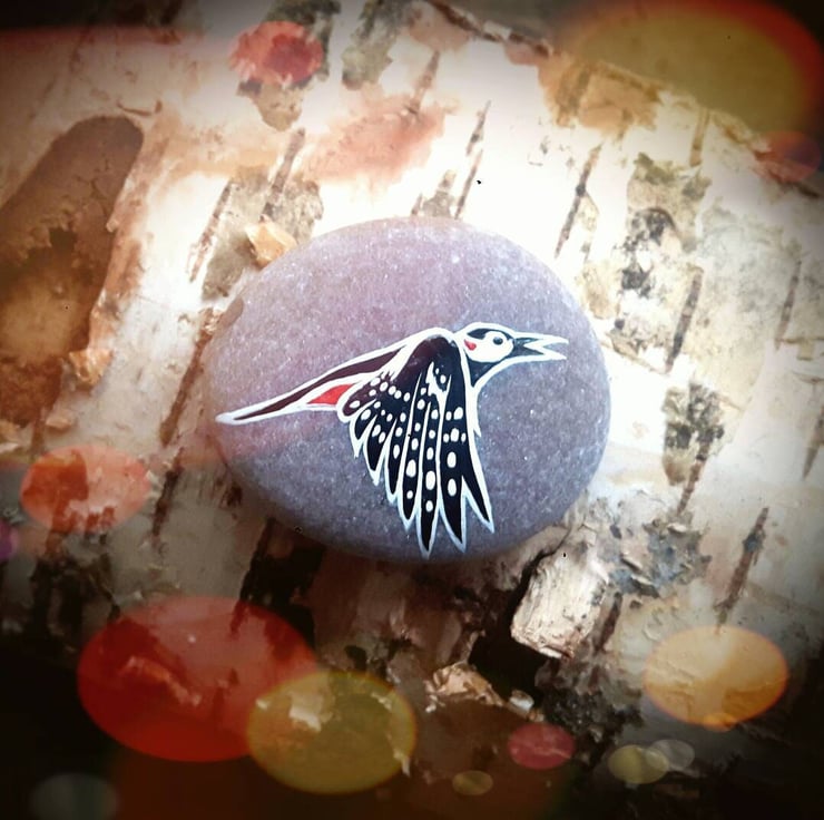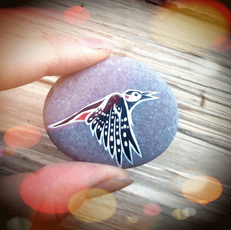 Smooth stone hand painted with a British great spotted woodpecker bird design