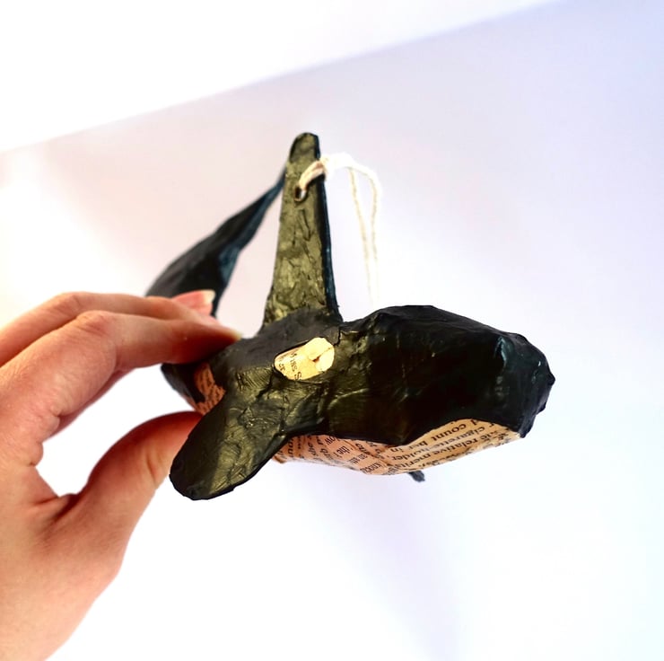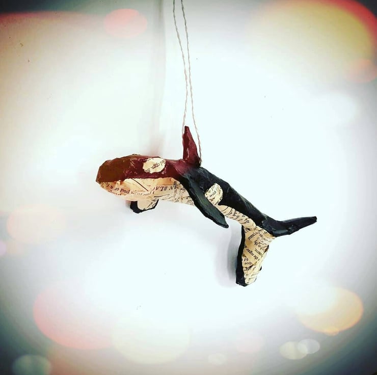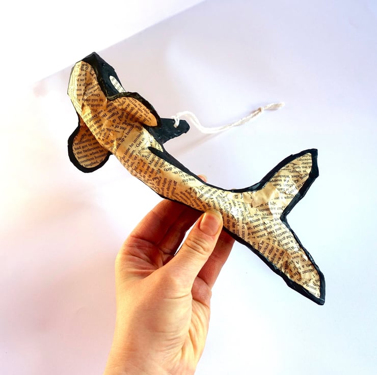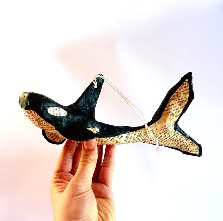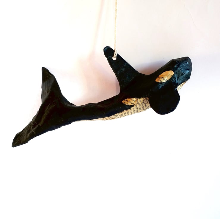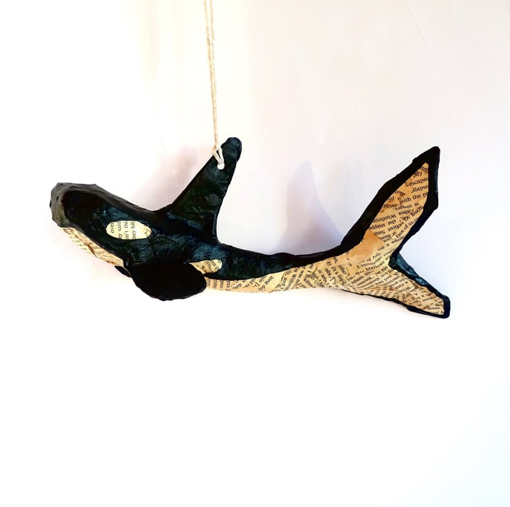 Miniature hanging killer whale orca model decoration hand made from papi r-mach . Coat colours created from recycled book pages and acrylic paint.