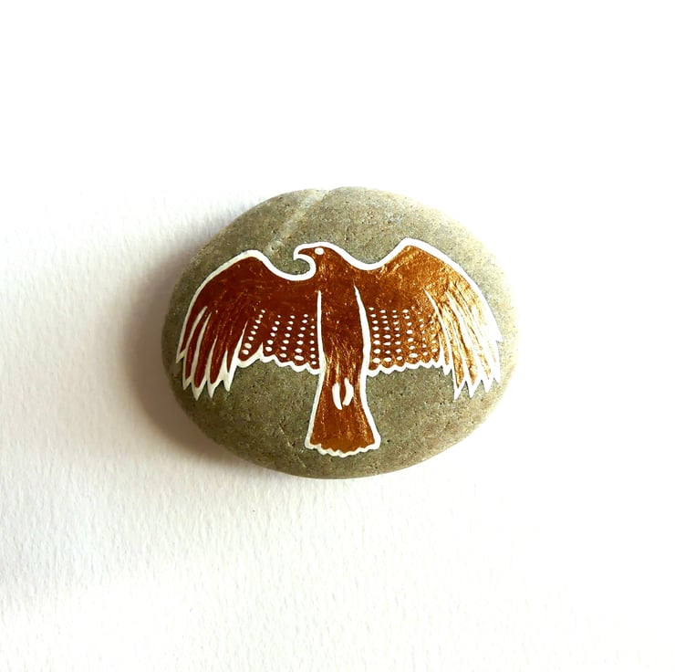 Smooth stone hand painted with a white and metallic copper hawk bird design