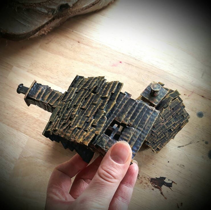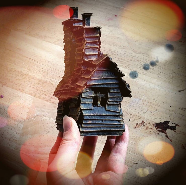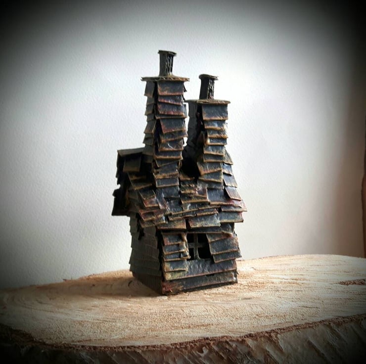 My little house models are inspired by coloured Scandinavian buildings and my childhood dolls' house built by my father. I created these unusual, quirky sculptures because I wanted to decorate my bedroom with little crooked wooden houses and miniature Canadian log cabins. I build these from recycled cardboard boxes (mostly Amazon packaging) and cut out and paint each small piece by hand. I carefully cut out each window. Each sculpture is unique in shape, appearance and character. The interior is also painted white as at home I fill my little houses with battery-powered fairy lights so that the windows glow with golden or red light on winter evenings.