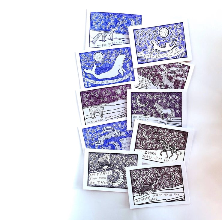My storybook animal cards are inspired by the stories I tell myself when I walk in the forest near my home. I created these unusual, quirky ink drawing cards because I wanted to decorate my bedroom with my stories, words and poetry. I make these cards from prints of my original ink paintings in my sketchbook. These are perfect for both children and adults, appealing to our desire for storytelling.