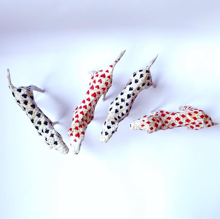 I created the coat colours from recycled book pages and acrylic paint, depicting patterns from playing cards instead of spots black spades and clubs, red hearts and diamonds.