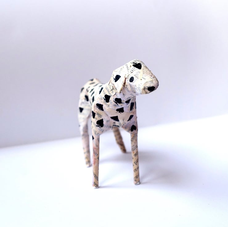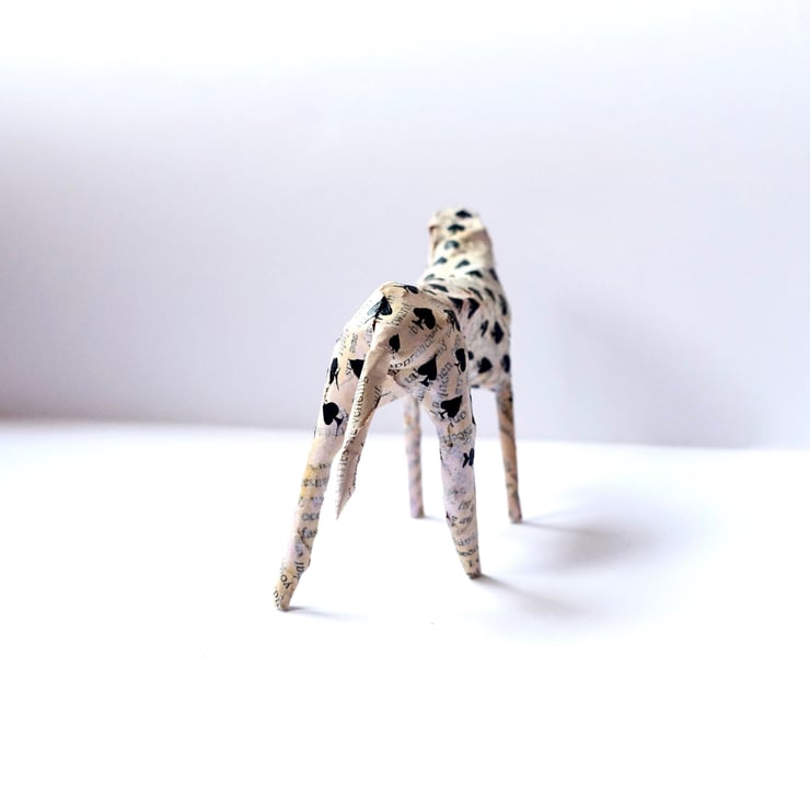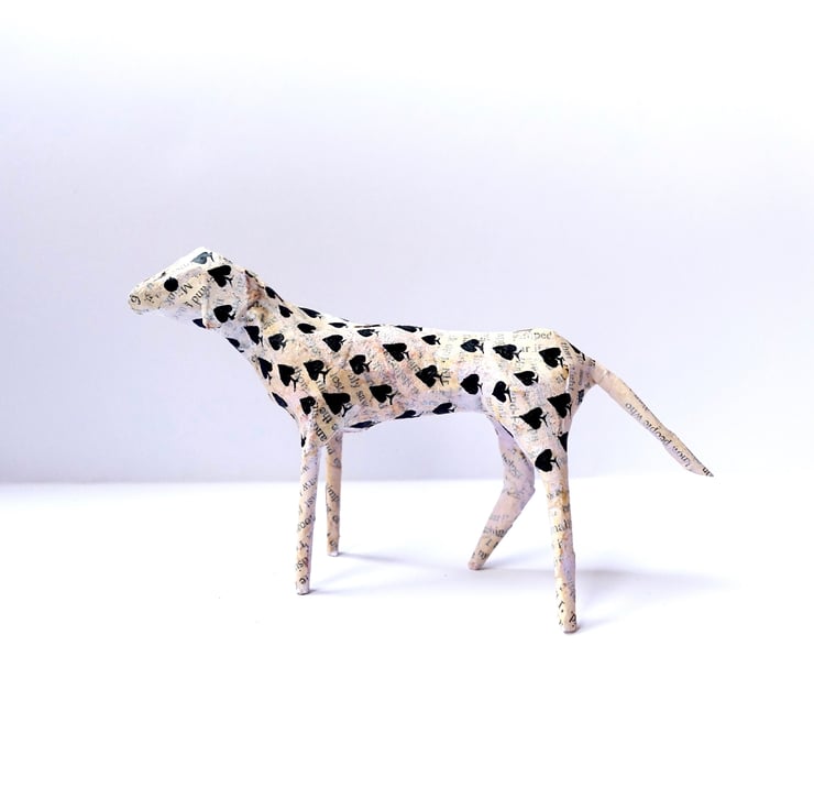 Miniature Dalmatian dog model hand made from recycled paper and book pages. Made using paper-mache and acrylic paint. Black spades design pattern instead of spots