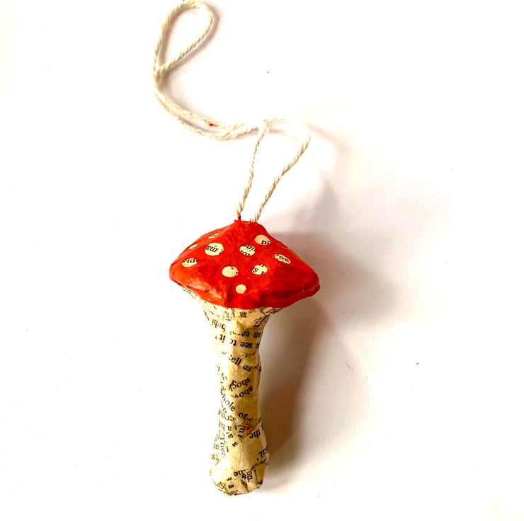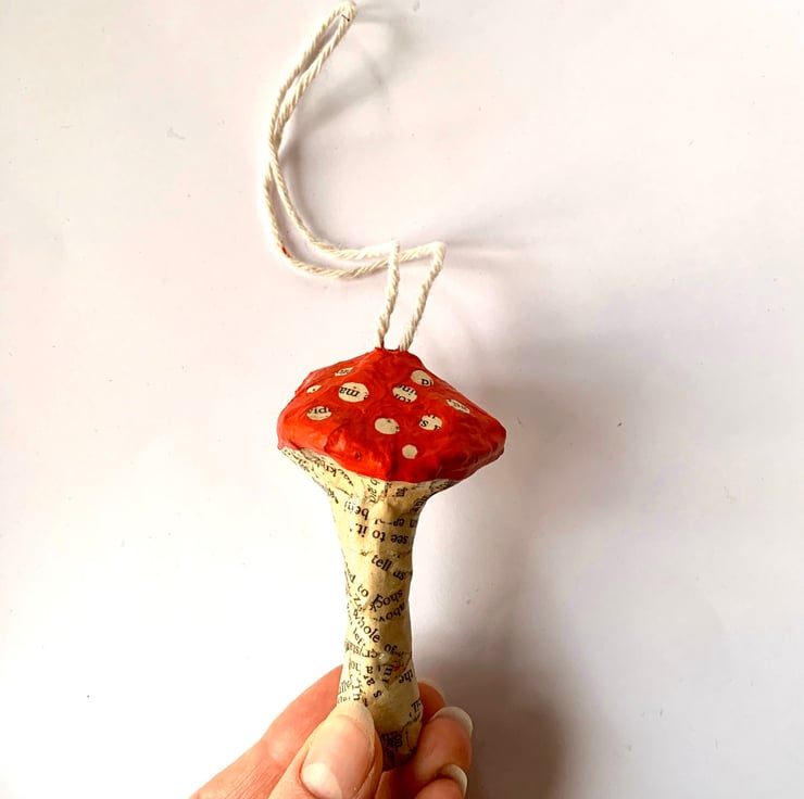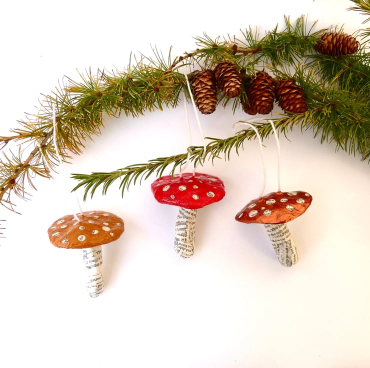 Miniature toadstools mushrooms models hand made from vintage books papi r-mach . Copper and red colours created from recycled book pages and acrylic paint.