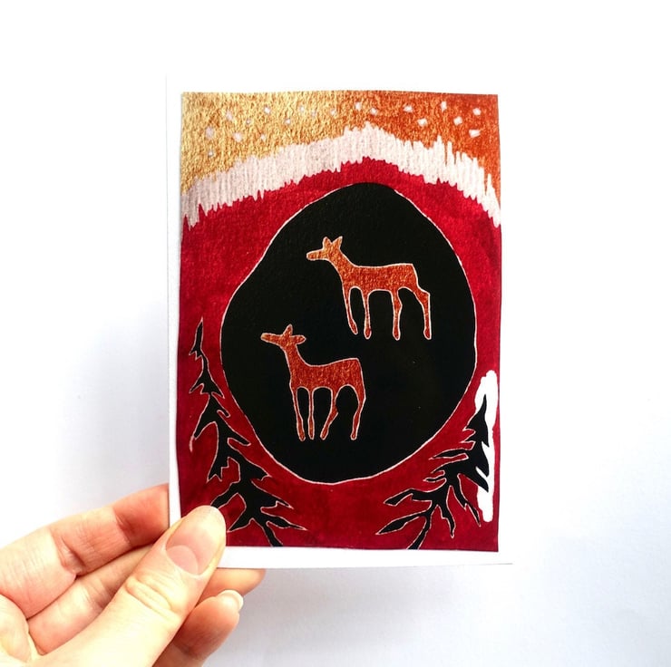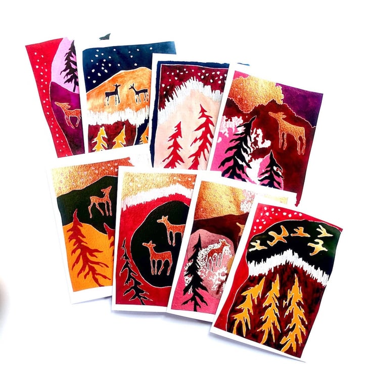 These cards are handmade from prints of my original ink paintings on thick BFK printmaking paper. The original illustrations are hand painted using acrylic and metallic inks.