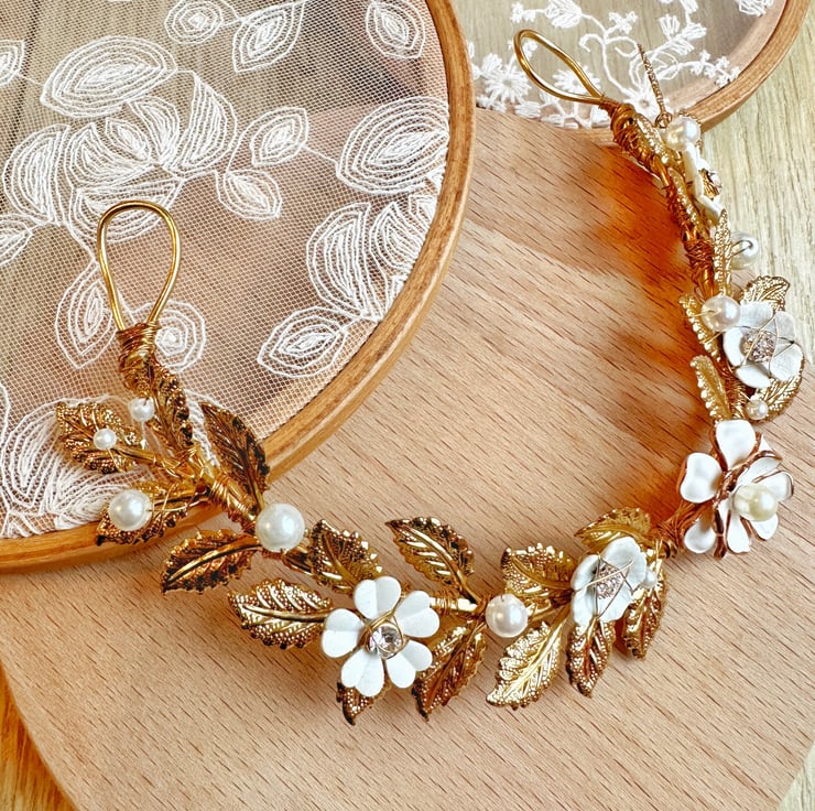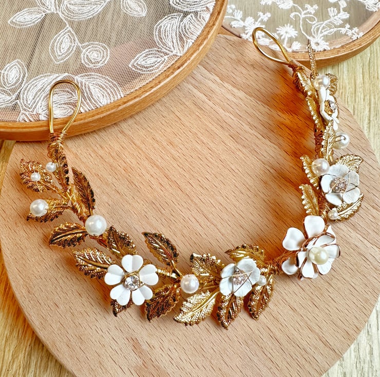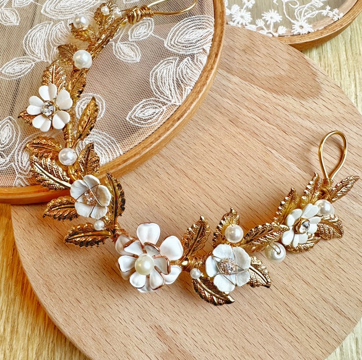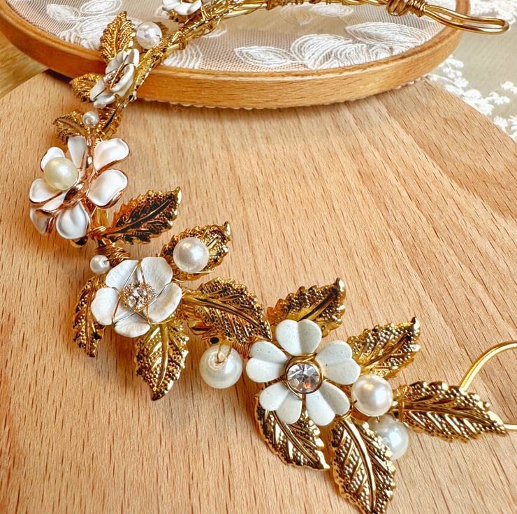 - Created with gold metal leaf, metal paint flower, rhinestone and glass pearl beads.