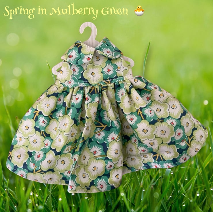 A pretty little dress in a floral print, to fit the Mulberry Green characters. The dress is made from best quality cotton and has a Peter Pan collar and a lined bodice.
