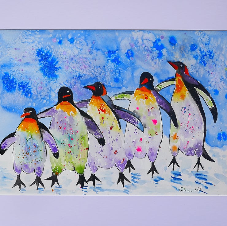 These Colourfl Penguins are painted in watercolours with some splashes of ink . The painting is size A3 and the Mount is size 16" x 20" to fit the same size frame