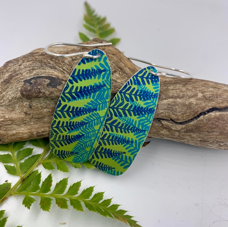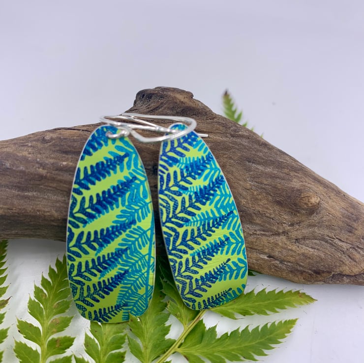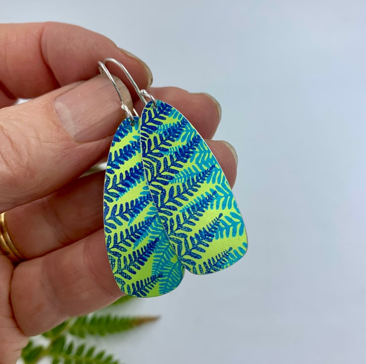 These bright and bold dangly earrings are made from anodised aluminium which has been hand printed with a beautiful fern leaf design in navy and turquoise The metal was dip dyed lime green.