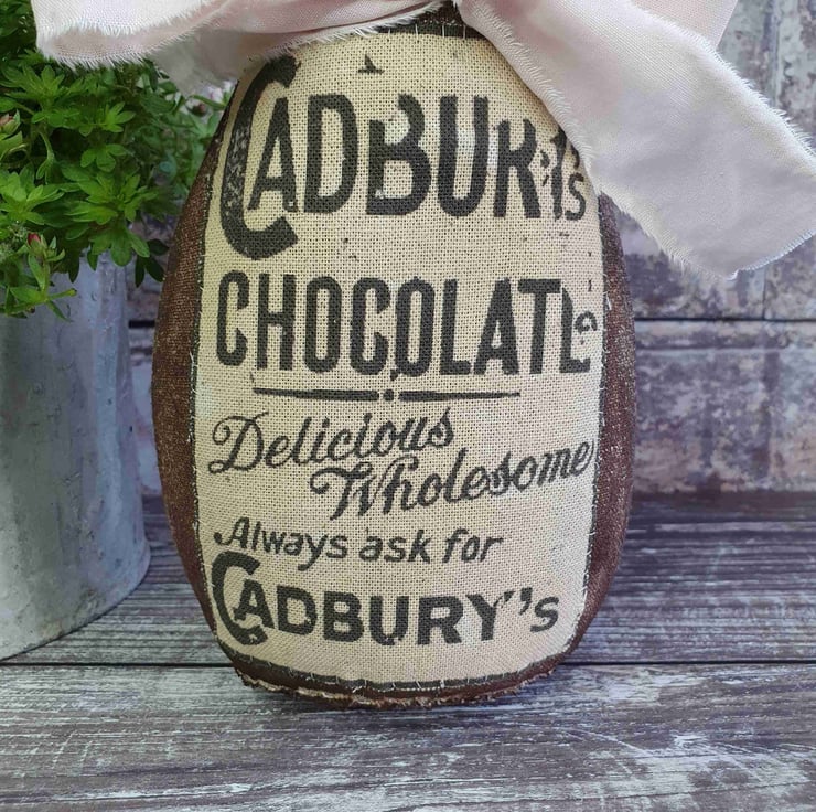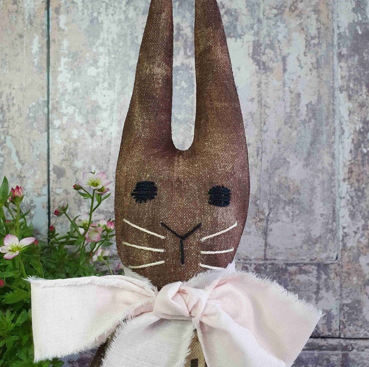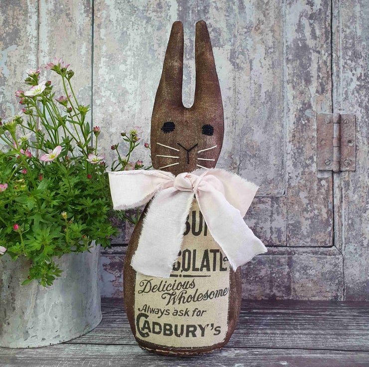 This primitive Easter bunny decoration has been made in the typical American Primitive Folk Art style. I firstly age my fabric with coffee, cinnamon and vanilla. It has then been painted with acrylic paint and sanded down to give it a worn rustic look. The face has been handstitched and a handmade ribbon tied to its neck. I have then handstitched the handmade vintage style advertising label to the front to finish. The bunny should stand on its own and would look great in your home for Spring and Easter.