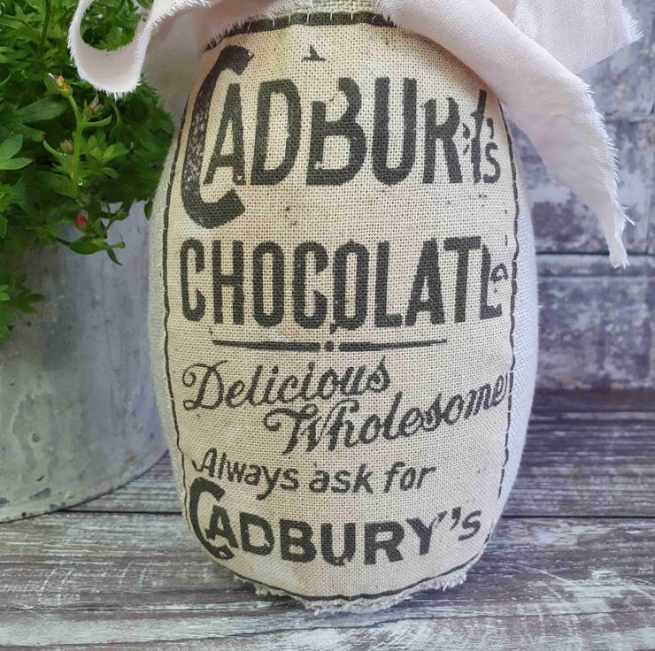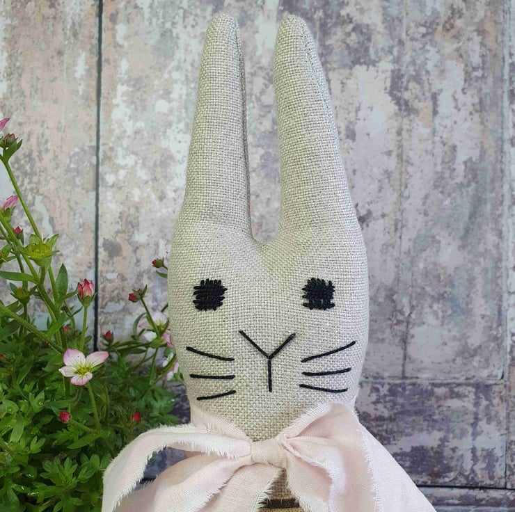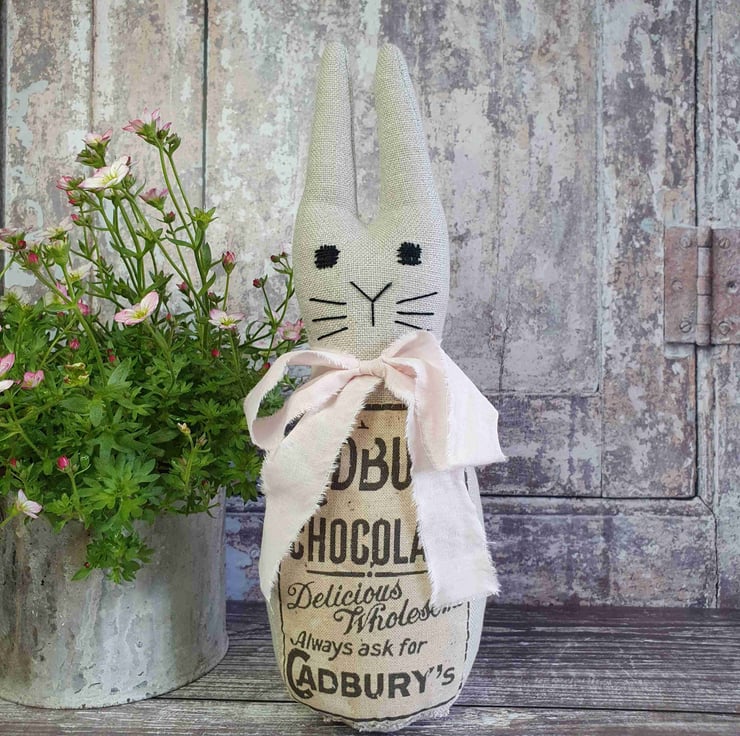 This primitive Easter bunny decoration has been made using grain sack fabric. It's face has been hand stitched and handmade ribbon has been tied around it's neck. A handmade vintage style advertising label has been hand stitched to the front to finish. The bunny should stand on its own and would look great in your home for Spring and Easter.