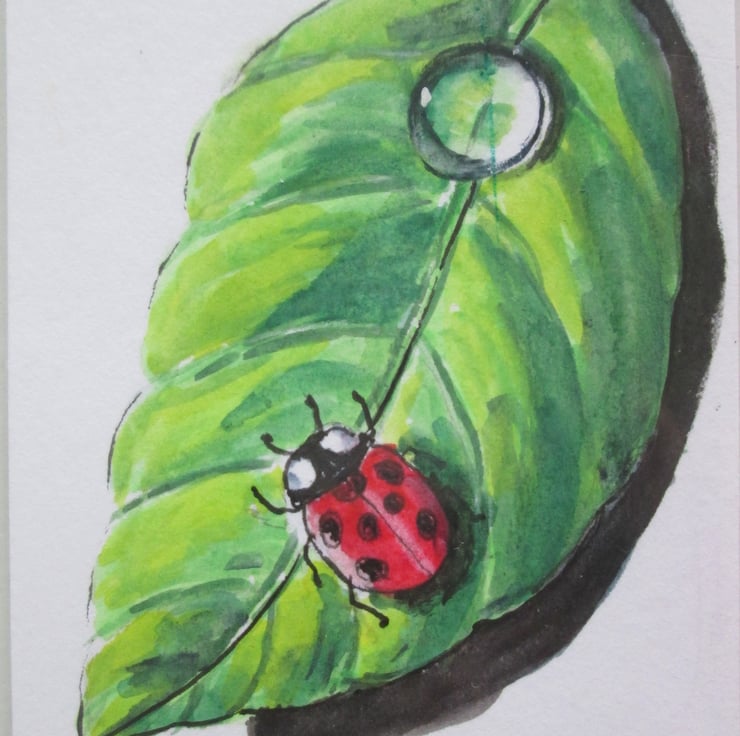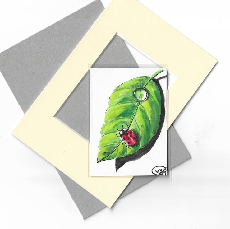 This OOAK trading card painting of a lovely red Ladybird and a water droplet on a Green Leaf. There is an option to purchase the painting only and to purchase it with a cream mount - see drop-down menu