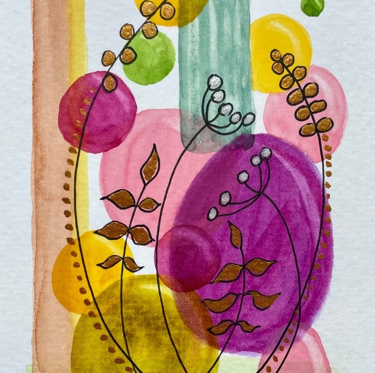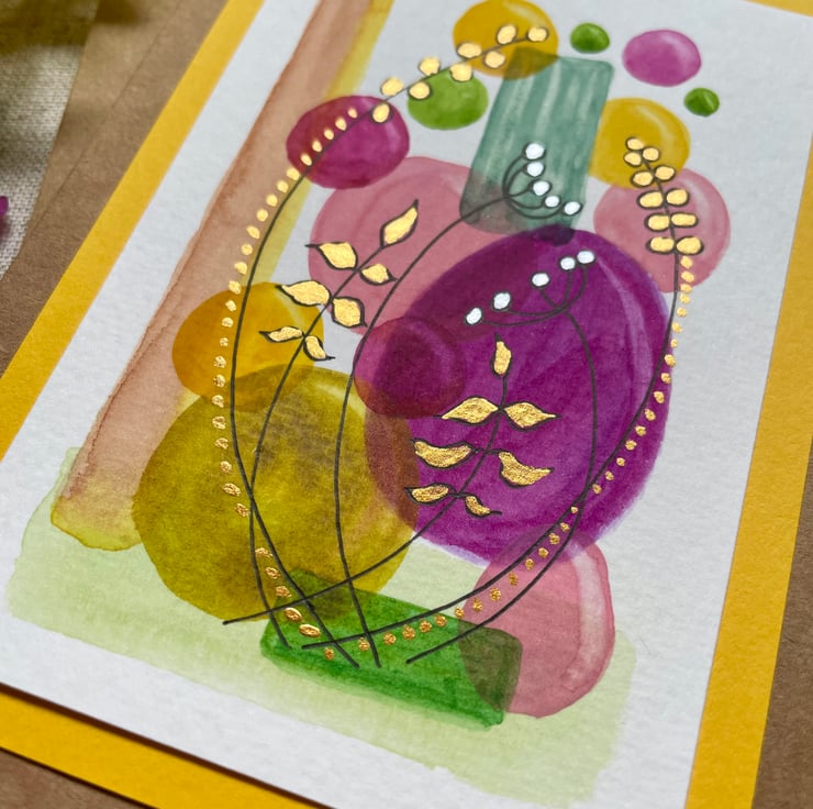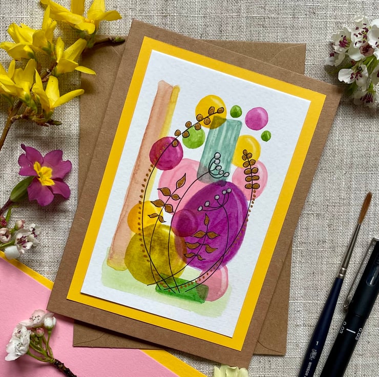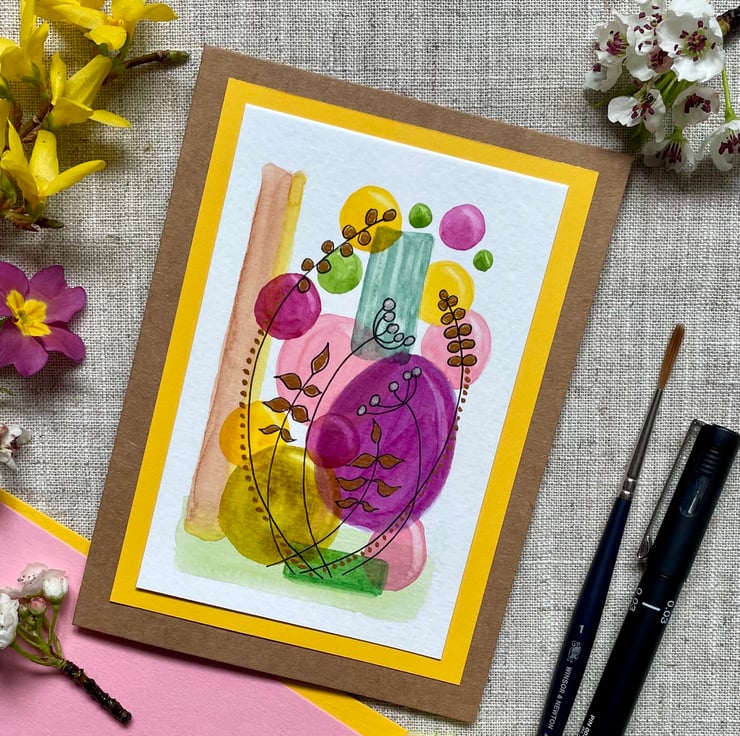 This card features an abstract painting in cheerful spring colours of yellows, purples, pinks and greens, hand painted with artist quality watercolour and overlaid with seed heads in ink with silver and gold watercolour paint, the card has been left blank for any occasion from birthday card to a thank you note but could also be framed and put up on a wall, or would make a pretty Mothers day or Easter card.