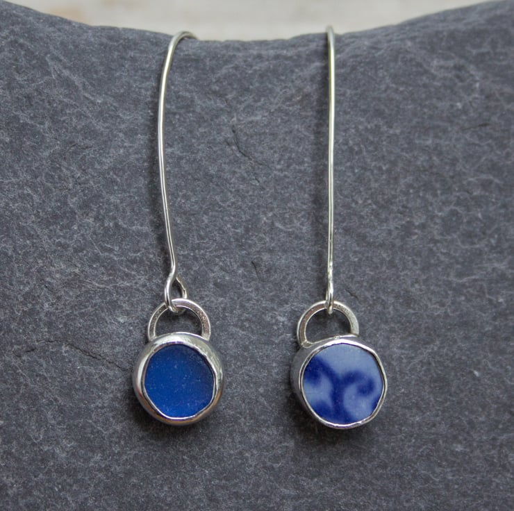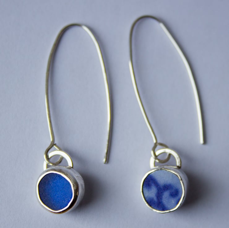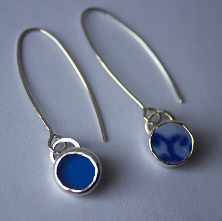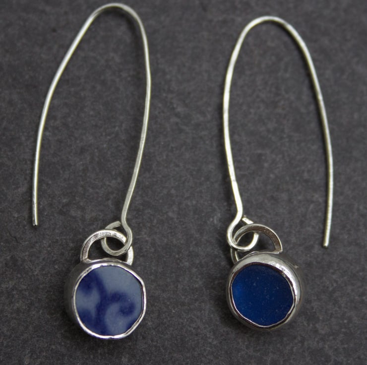 Complementary rounds of blue sea glass and blue and white patterned sea pottery set in recycled fine and sterling silver and soldered to hand forged silver ear wires for a dainty drop. These mismatched blue earrings are polished to an attractive light catching sheen.