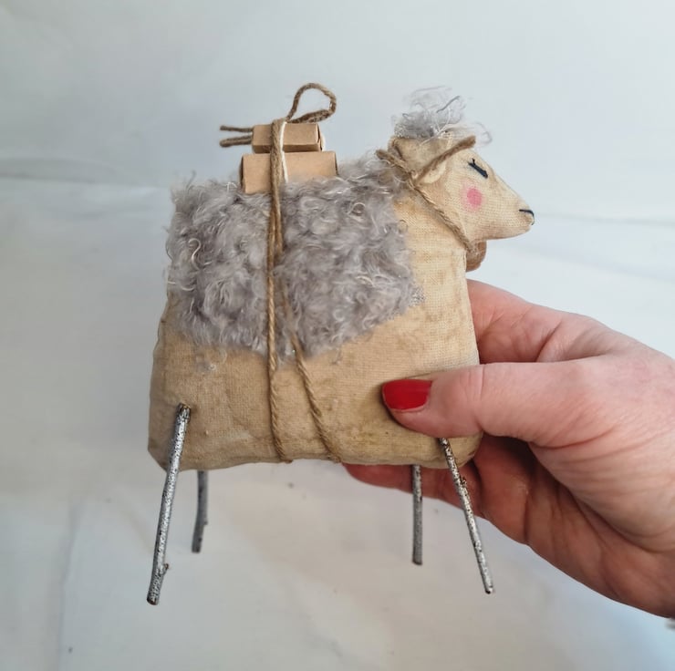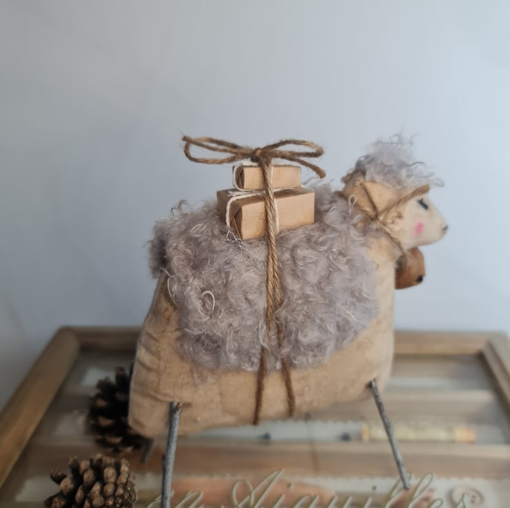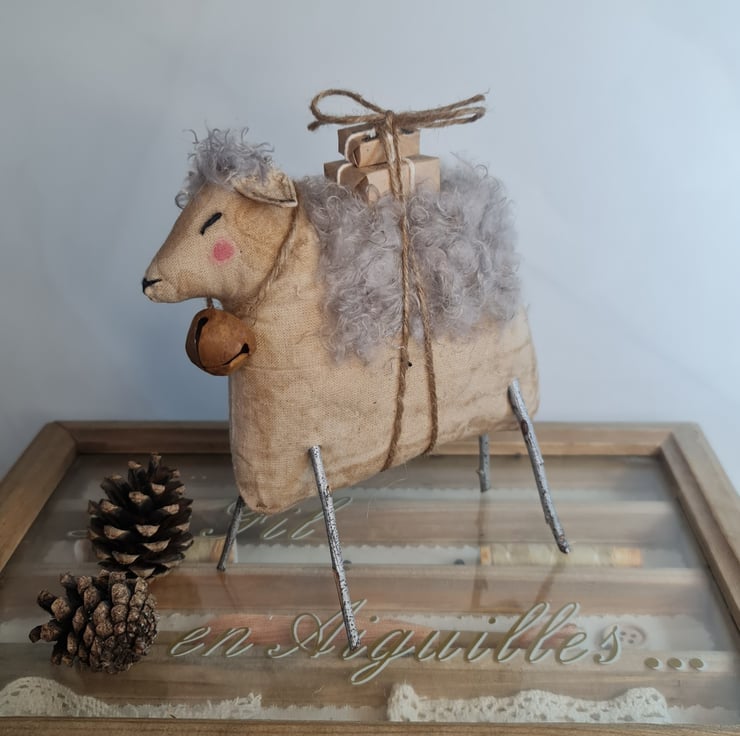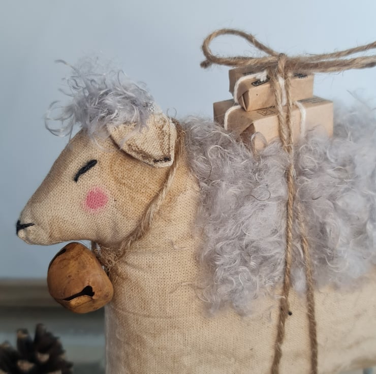 This quirky chap is hand and machine stiched in unbleached cotton. He is stained to give and aged primitive feel to him. He is adorned with a power blue-grey coat. He has silver branch legs, and he is carrying parcels tied on with jute. Around his neck is a rusty bell also tied with jute. His eyes and nose are embroidered.