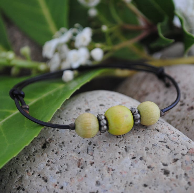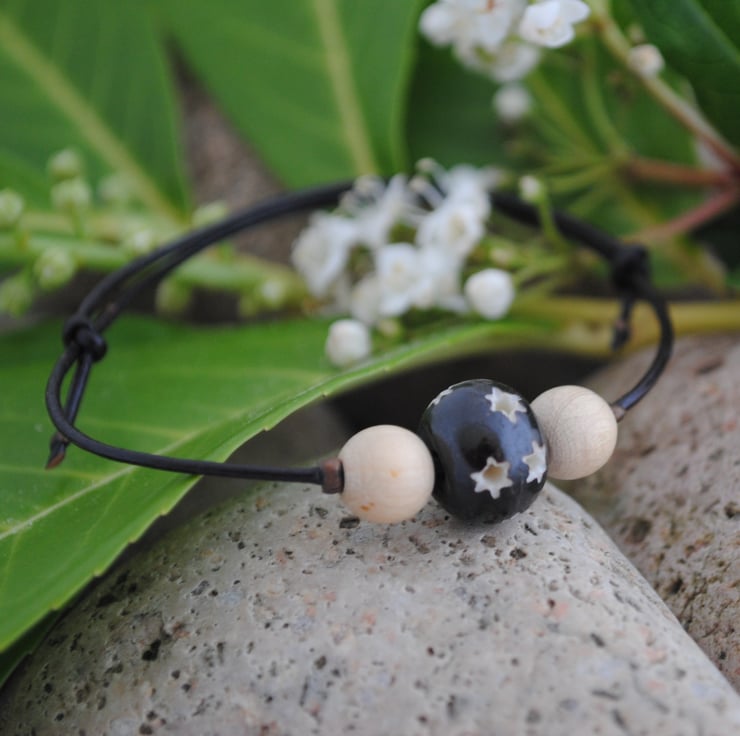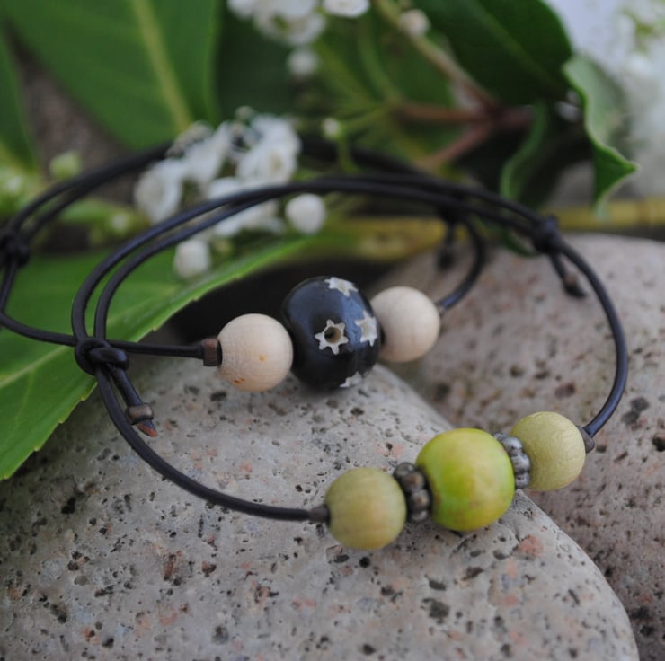 A set of two friendship bracelets made with black leather. One has a brown / black star bead with natural wood beads and the other has green wood beads with silver-plated daisy spacers.