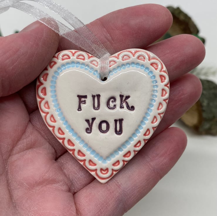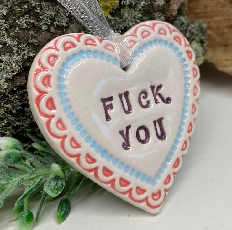 This little heart is made from white earthenware clay, imprinted with the words FUCK YOU. The perfect gift to let someone know how much you love them! Some of the letters may be a bit higgledy piggledy but they have been stamped with love! It has been fired twice, once to the bisque stage and then a second firing for the clear glaze. It measures 4.5 centimetres wide x 5cm height x 5mm thick. It can be hung outside.