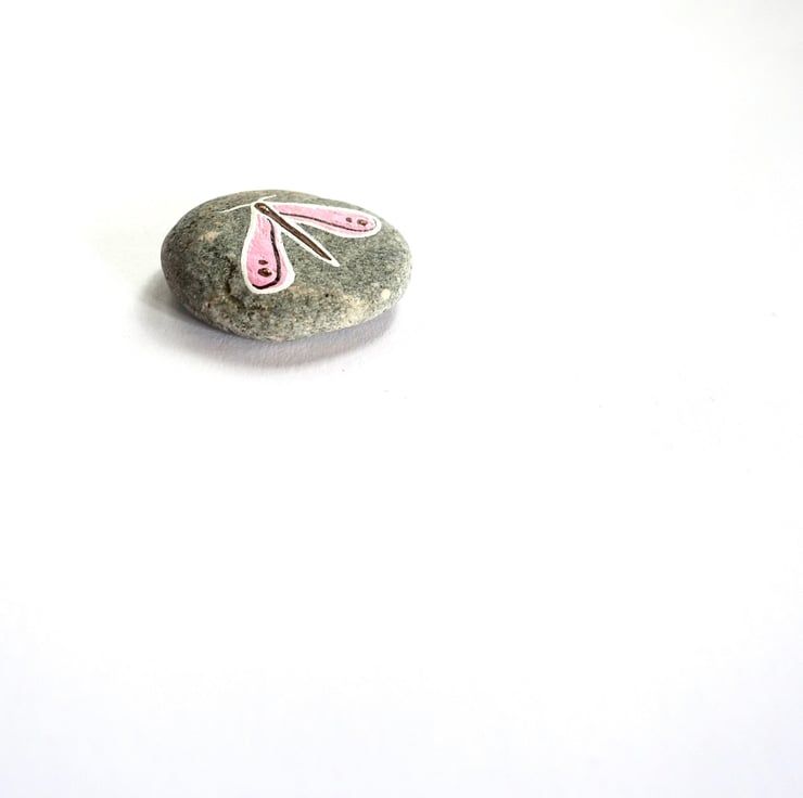 Smooth pebble hand painted with a white, pink and metallic copper coloured moth insect design