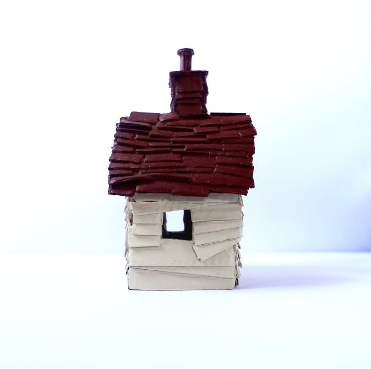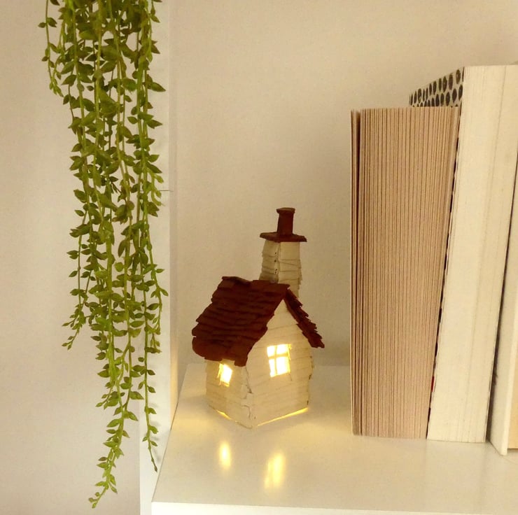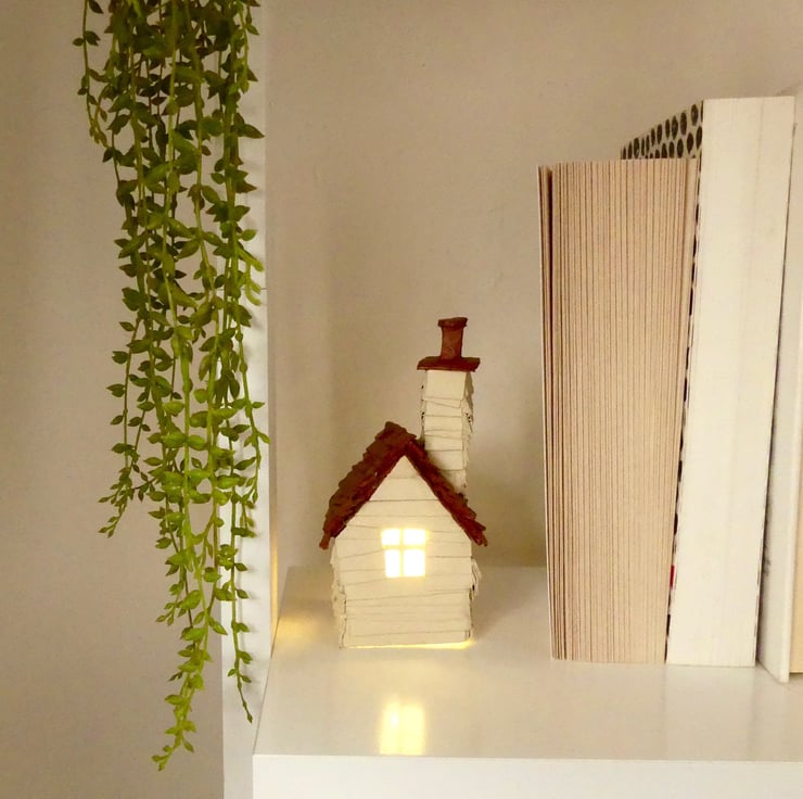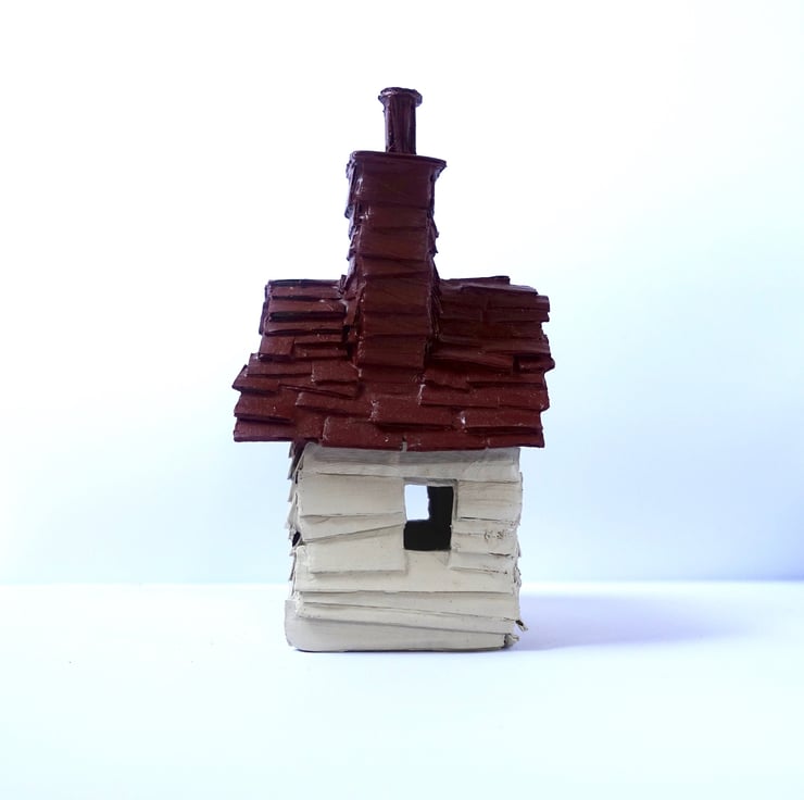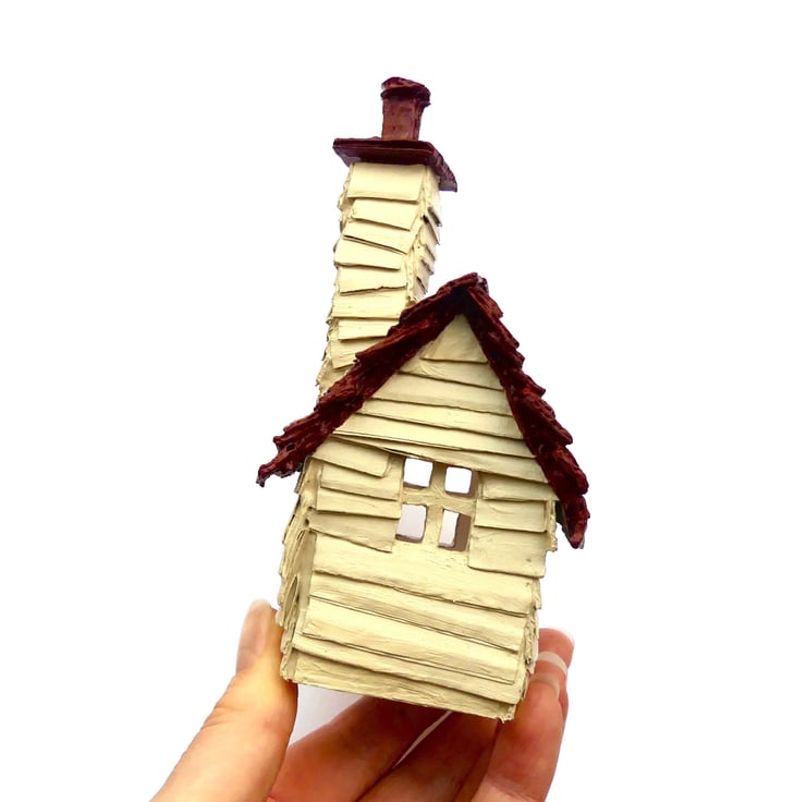 My little house models are inspired by coloured Scandinavian buildings and my childhood dolls' house built by my father. I created these unusual, quirky sculptures because I wanted to decorate my bedroom with little crooked wooden houses and miniature Canadian log cabins. I build these from recycled cardboard boxes (mostly Amazon packaging) and cut out and paint each small piece by hand. I carefully cut out each window. Each sculpture is unique in shape, appearance and character. The interior is also painted white as at home I fill my little houses with battery-powered fairy lights so that the windows glow with golden or red light on winter evenings.