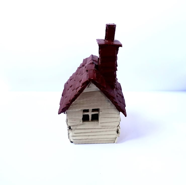 Little brown and beige house sculpture handmade from recycled cardboard boxes