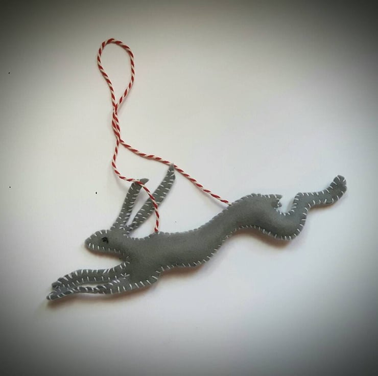 Handmade hanging leaping hare/rabbit decoration made from stuffed black coloured felt and metallic copper thread.