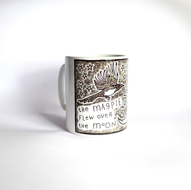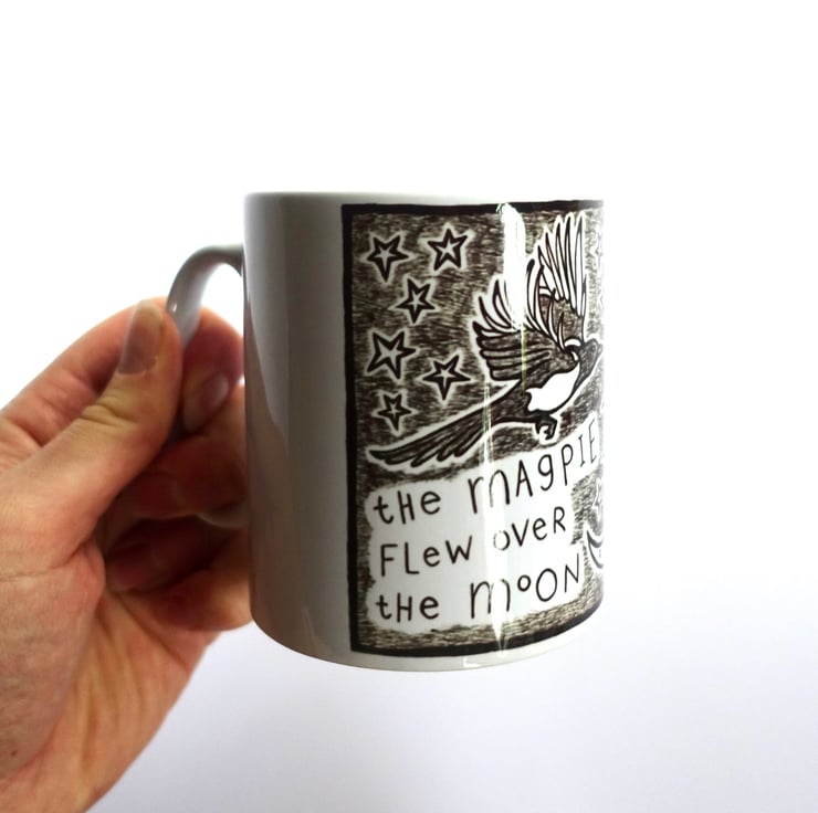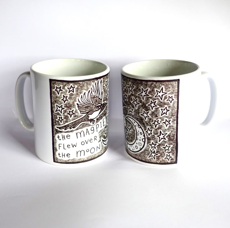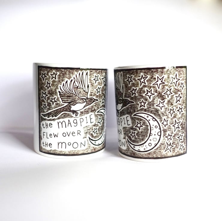 Set of 2 ceramic mugs printed with my black and white magpie bird illustration