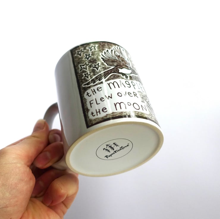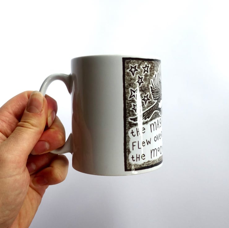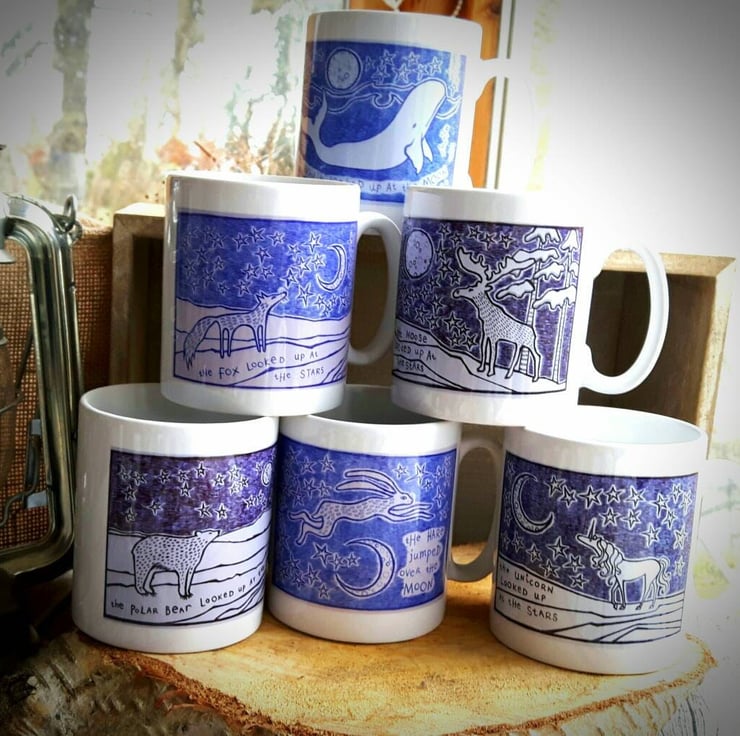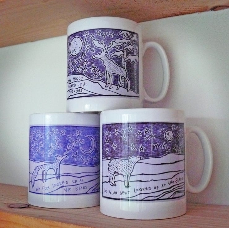 My storybook animal illustrations are inspired by the stories I tell myself when I walk in the forest near my home. I created these unusual, quirky ink drawings because I wanted to decorate my bedroom with my stories, words and poetry. These enamel mugs are created from prints of my original ink drawings in my sketchbook.