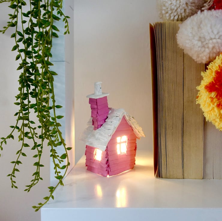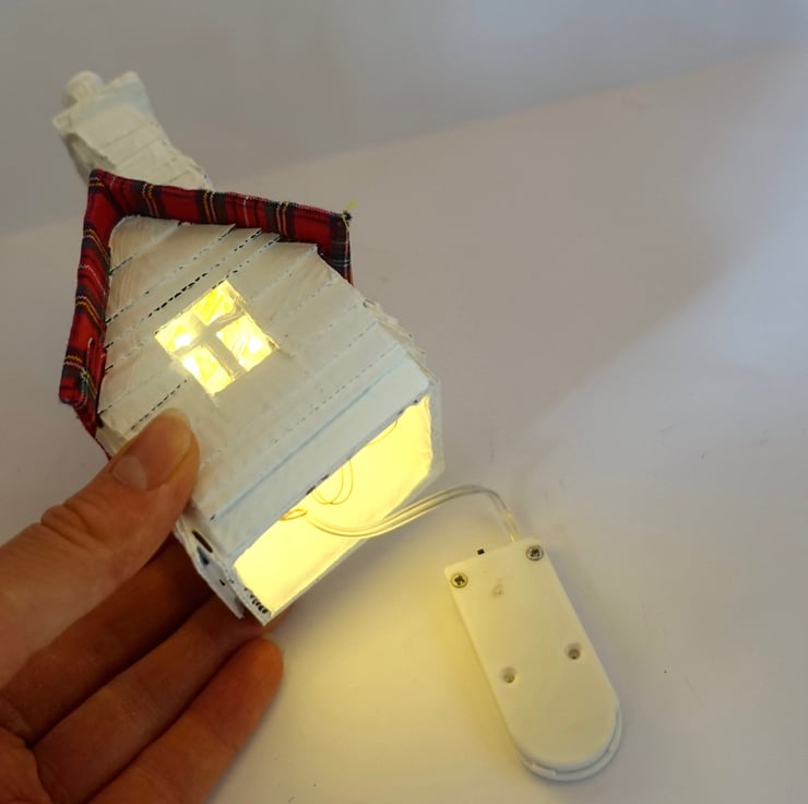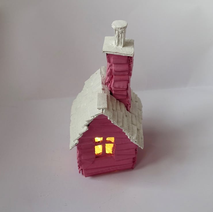 My little house models are inspired by coloured Scandinavian buildings and my childhood dolls' house built by my father. I created these unusual, quirky sculptures because I wanted to decorate my bedroom with little crooked wooden houses and miniature Canadian log cabins. I build these from recycled cardboard boxes (mostly Amazon packaging) and cut out and paint each small piece by hand. I carefully cut out each window. Each sculpture is unique in shape, appearance and character. The interior is also painted white as at home I fill my little houses with battery-powered fairy lights so that the windows glow with golden or red light on winter evenings.