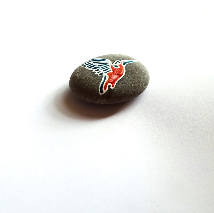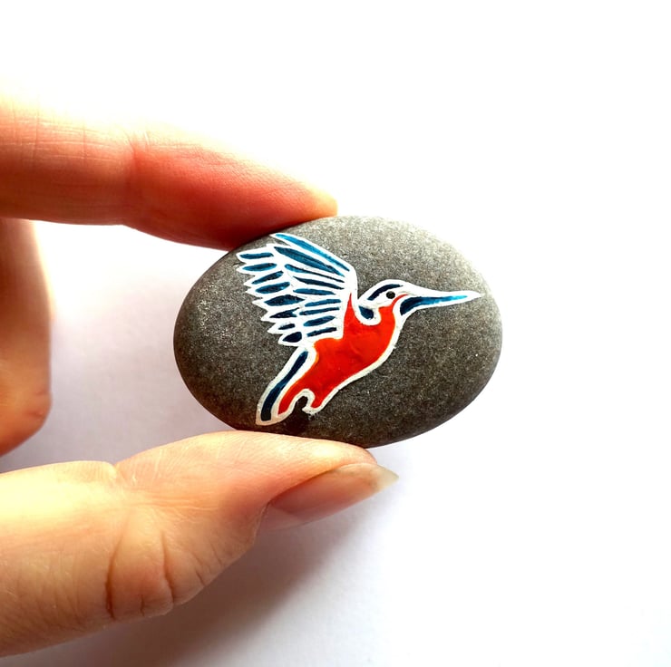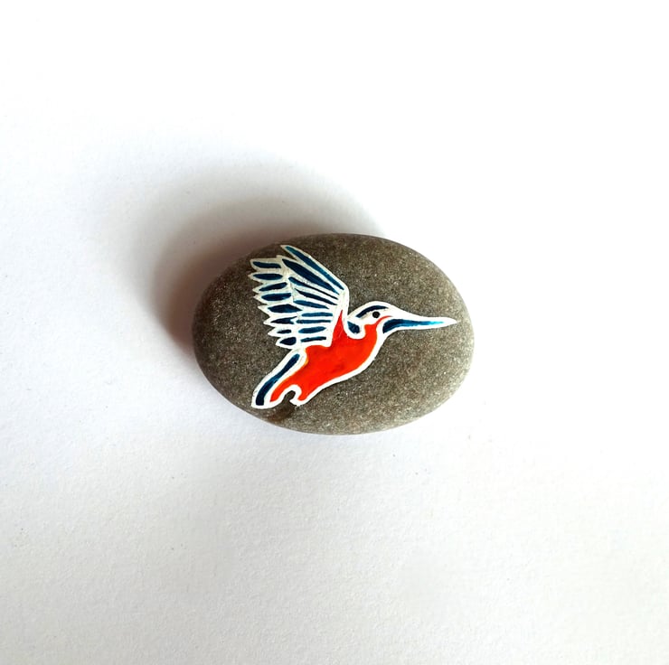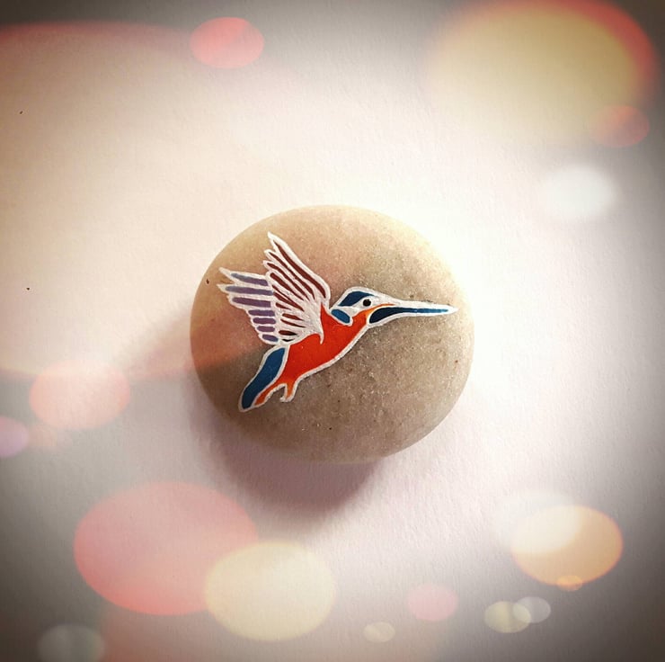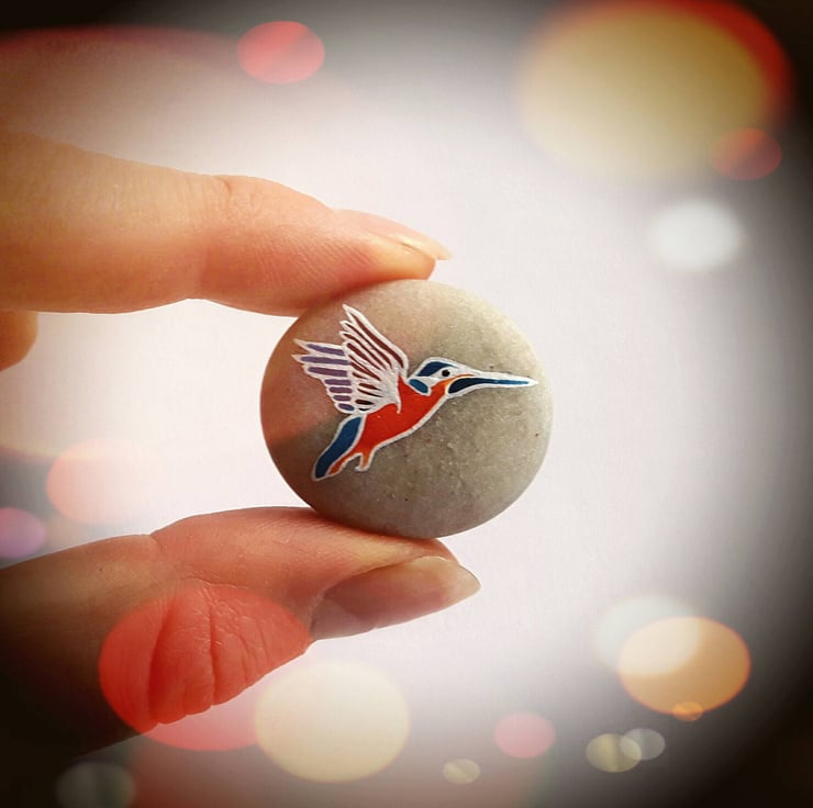 Smooth pebble hand painted with a coloured kingfisher bird design