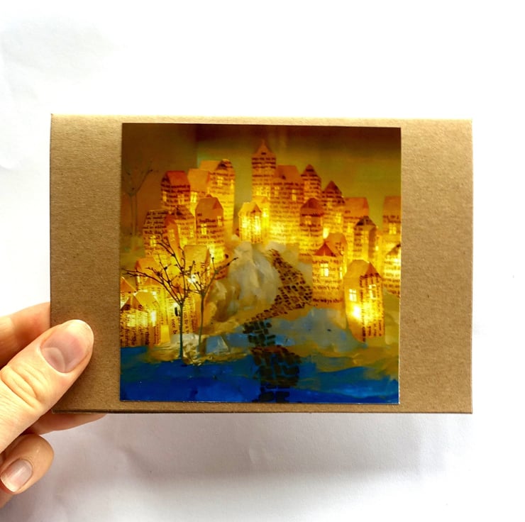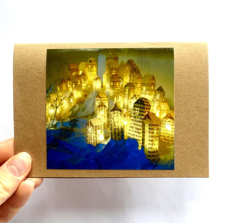 My city of dreams paper sculptures are inspired by the stories I tell myself when I walk in the forest near my home. I created these unusual, quirky sculptures because I wanted to decorate my bedroom with my stories, words and found poetry. I make these from recycled vintage book pages. Each artwork is unique in appearance and character.