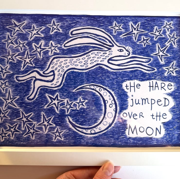 Giclee print produced from one of my original ink drawings. Lettering reads "The Hare Jumped Over The Moon".