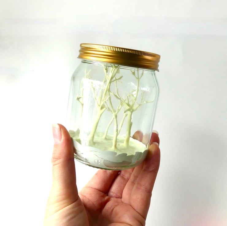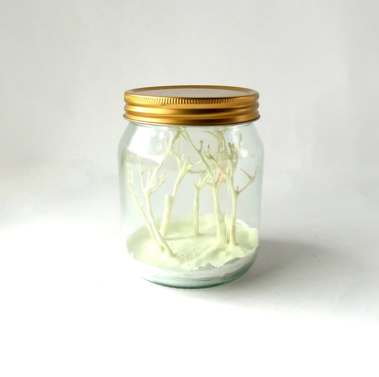 Tiny forest decoration inside a jar made using dry twigs and glow in the dark paint. Also available as a hanging jar decoration or in glow in the dark green or bright orange.