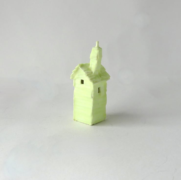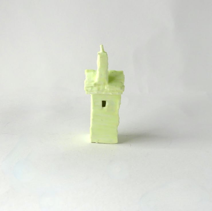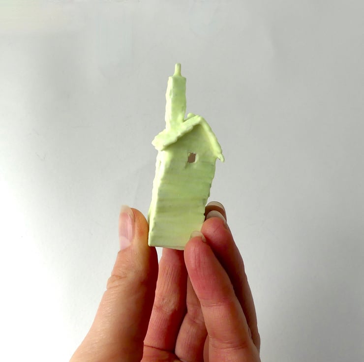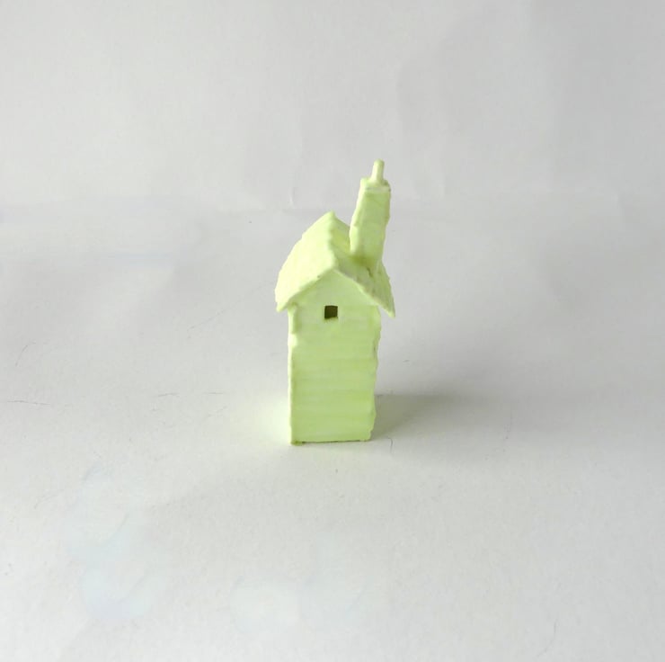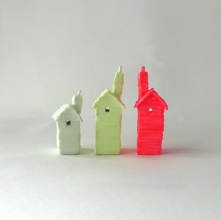 My little house models are inspired by coloured Scandinavian buildings and my childhood dolls' house built by my father. I created these unusual, quirky sculptures because I wanted to decorate my bedroom with little crooked wooden houses and miniature Canadian log cabins. I build these from recycled cardboard boxes (mostly Amazon packaging) and cut out and paint each small piece by hand. I carefully cut out each window. Each sculpture is unique in shape, appearance and character. The interior is also painted white as at home I fill my little houses with battery-powered fairy lights so that the windows glow with golden or red light on winter evenings.