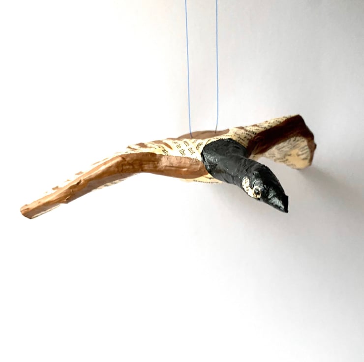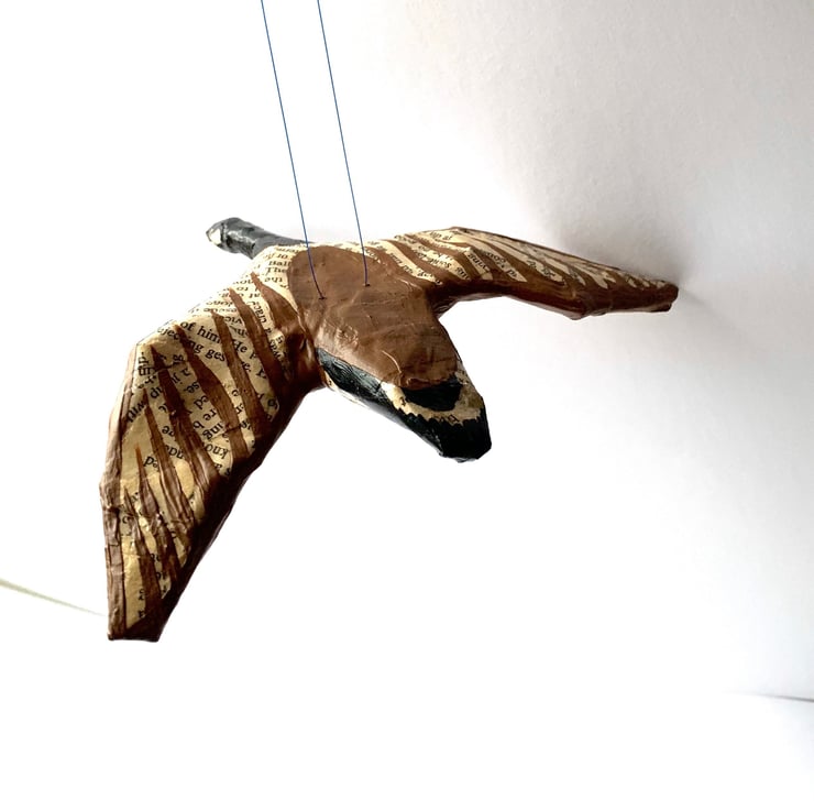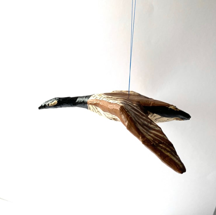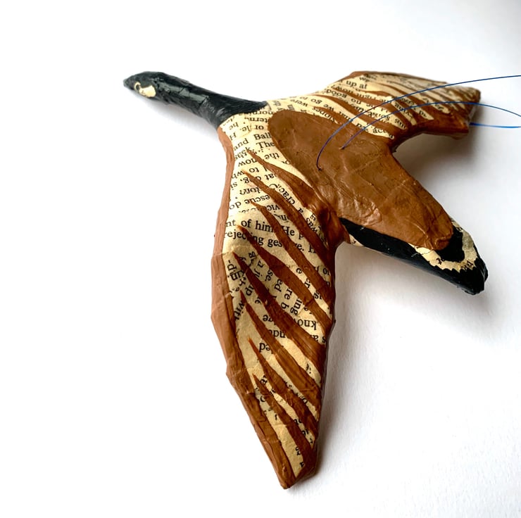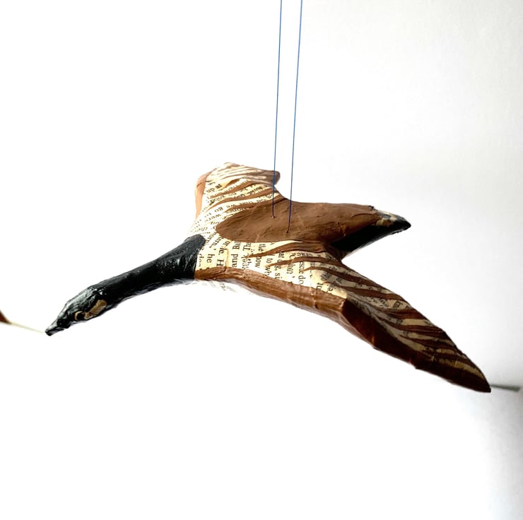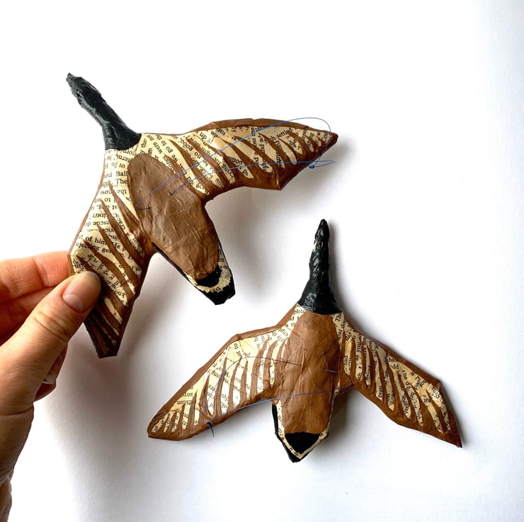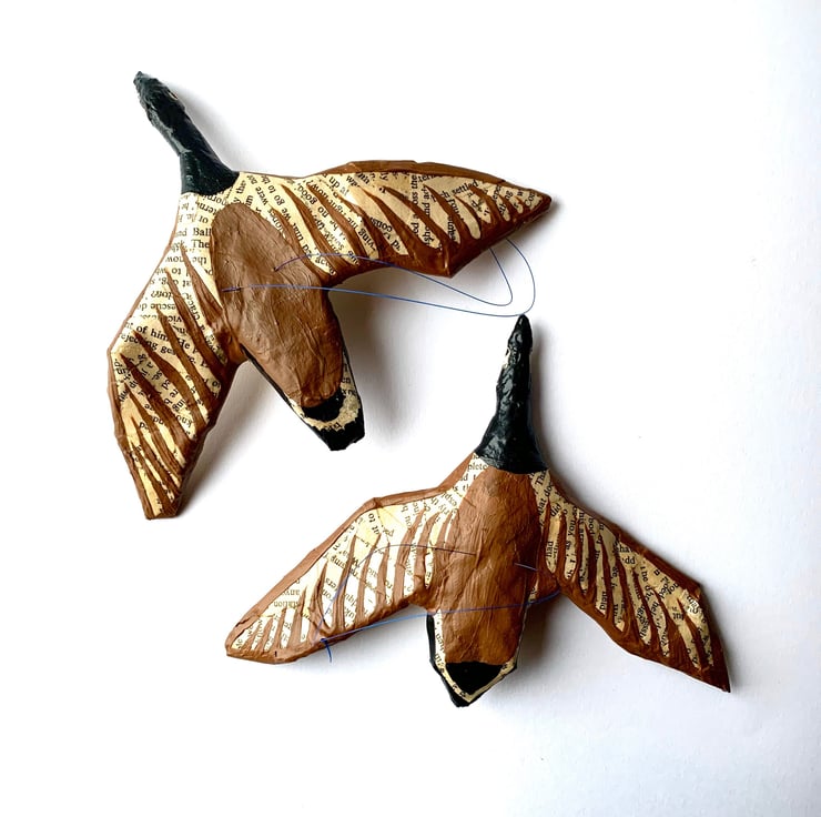 Set of 2 flying Canada Geese models hand made from papier-mache and acrylic paint. Coat colour made from recycled book pages and acrylic paint. Black details painted in acrylic paint.