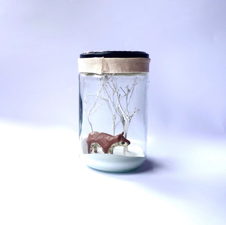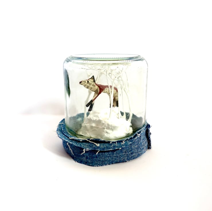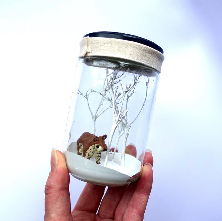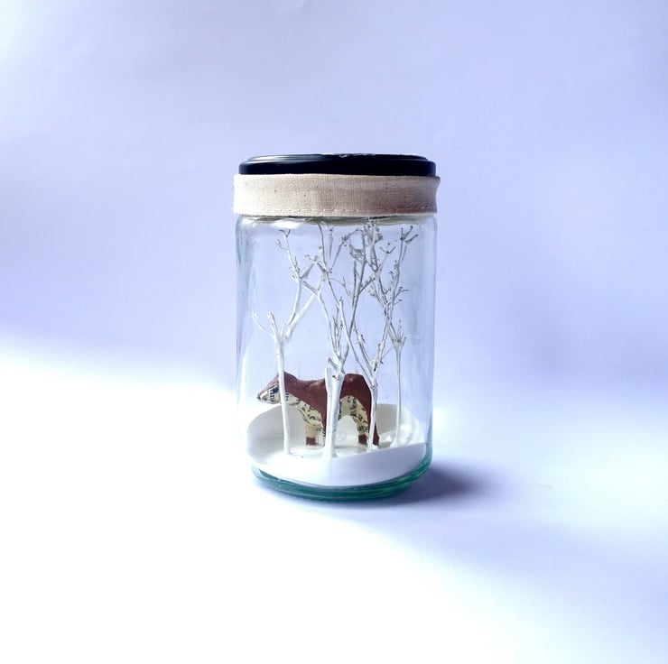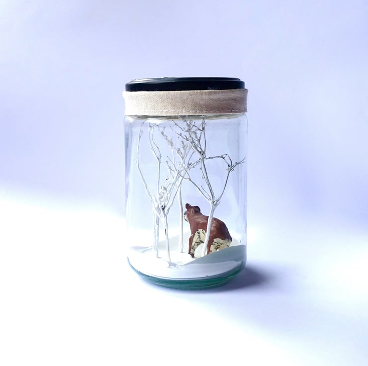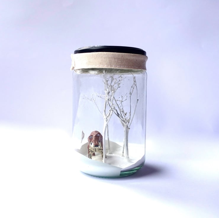 I have created a miniature white winter forest inside a jar using found materials. A tiny paper bear model made from recycled old book pages sits in the middle of the trees and snowy white paint. I have carefully sculpted each element and painted it by hand. The jar is wrapped in reclaimed denim jeans fabric strips.
