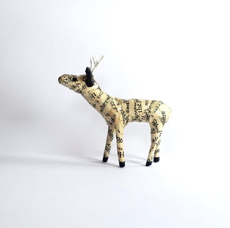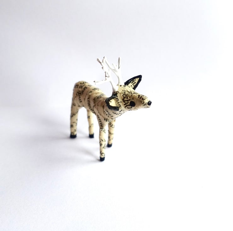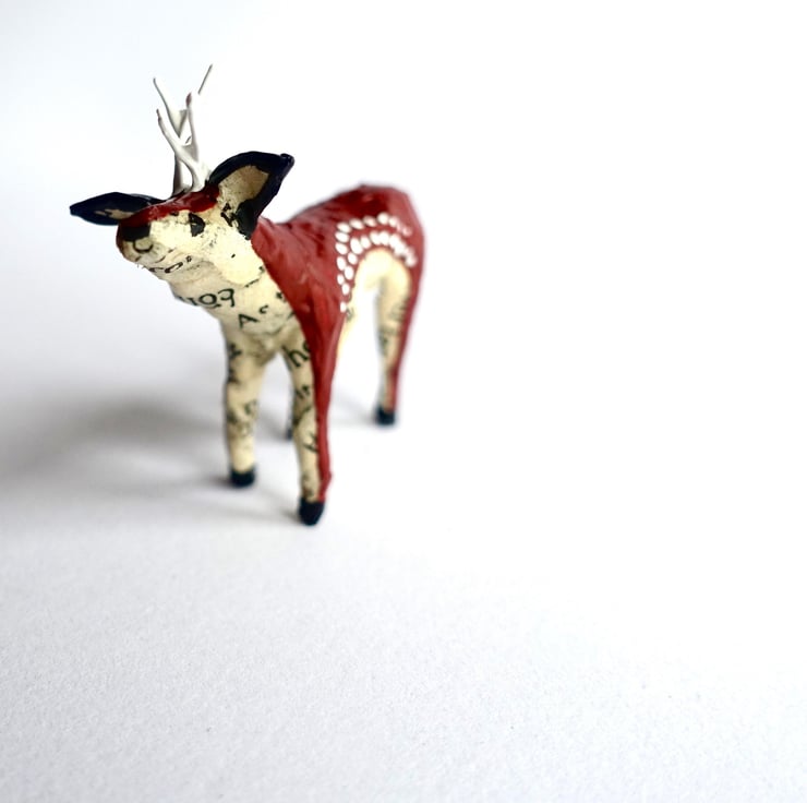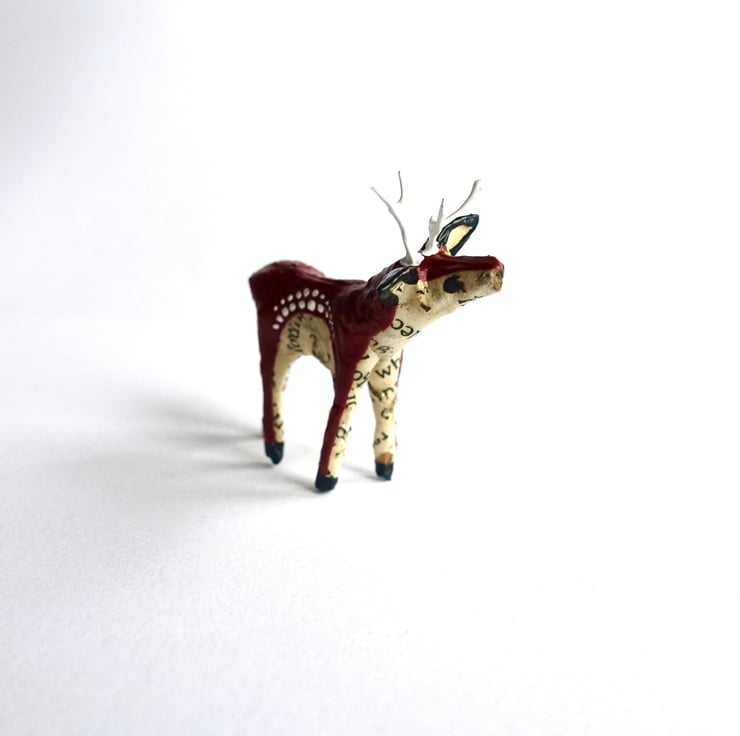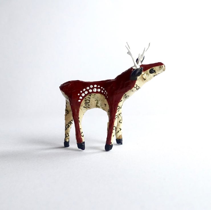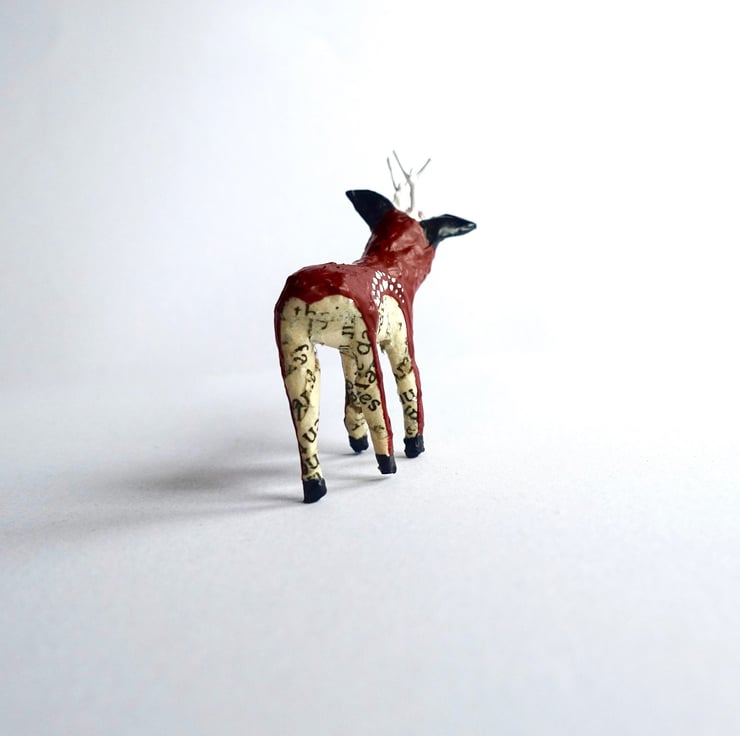 These tiny deer decorations are hand made from papier-maché and acrylic paint by me in my home studio in Scotland. Combining my loves of books and animals, they are adorned with natural red colour and tiny white spots.