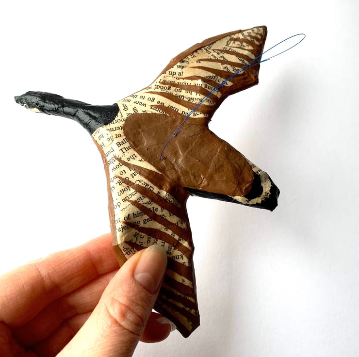 Flying Canada Goose model hand made from papier-mache and acrylic paint. Coat colour made from recycled book pages and acrylic paint. Black details painted in acrylic paint.