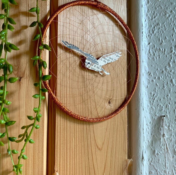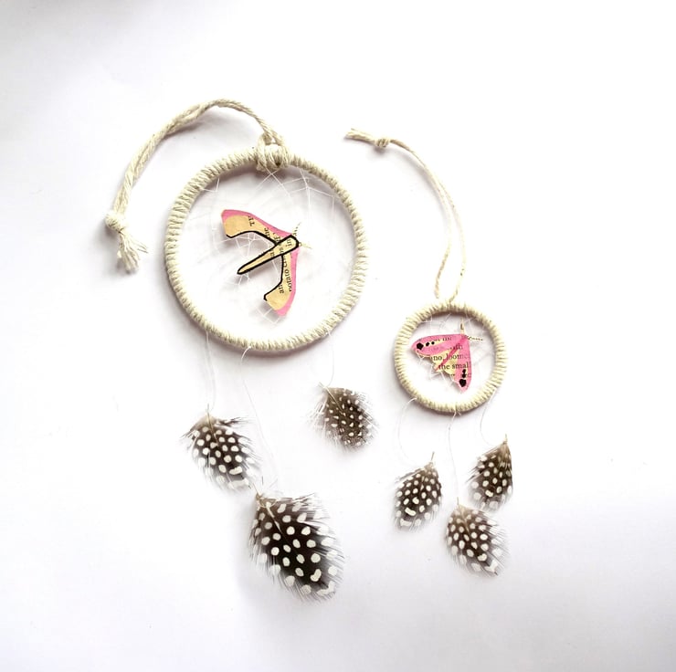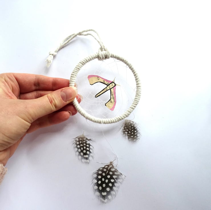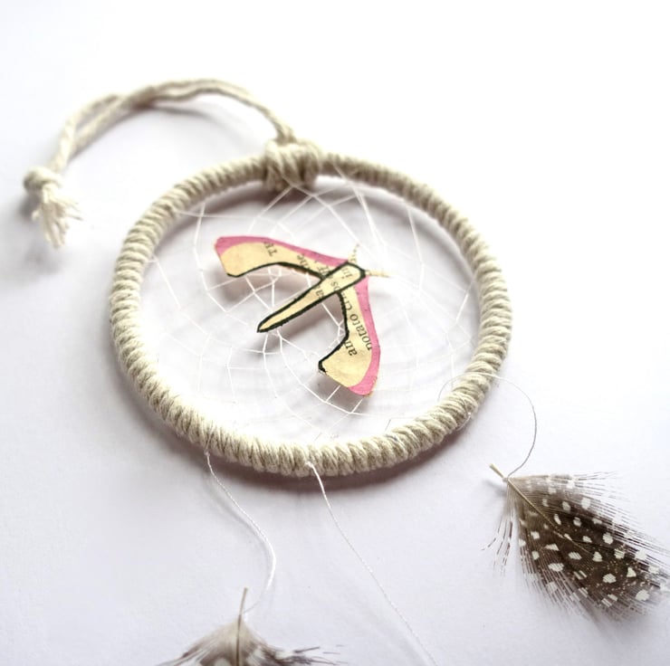 Unique handmade pink moth spirit dreamcatcher made from recycled vintage book pages